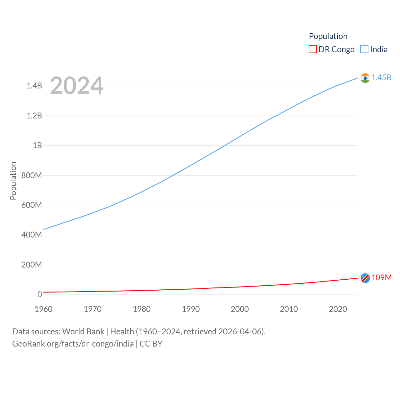 The DR Congo has a population of 109M (ranked 15/197), compared with 1.45B in India (ranked 1/197). The DR Congo's land area is 875,313 sq mi versus 1,147,955 sq mi for India (ranked 11th vs. 7th).