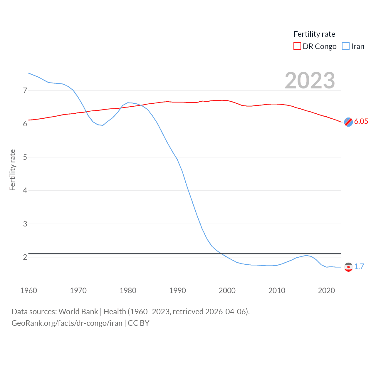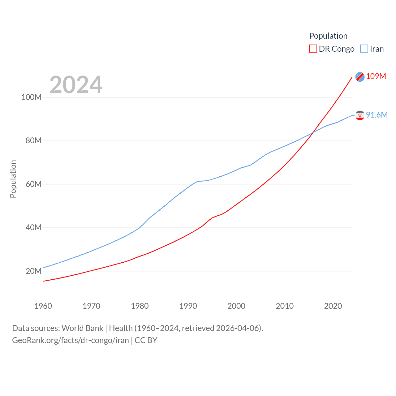 The DR Congo has a population of 109M (ranked 15/197), compared with 91.6M in Iran (ranked 17/197). The DR Congo's land area is 875,313 sq mi versus 626,451 sq mi for Iran (ranked 11th vs. 17th).