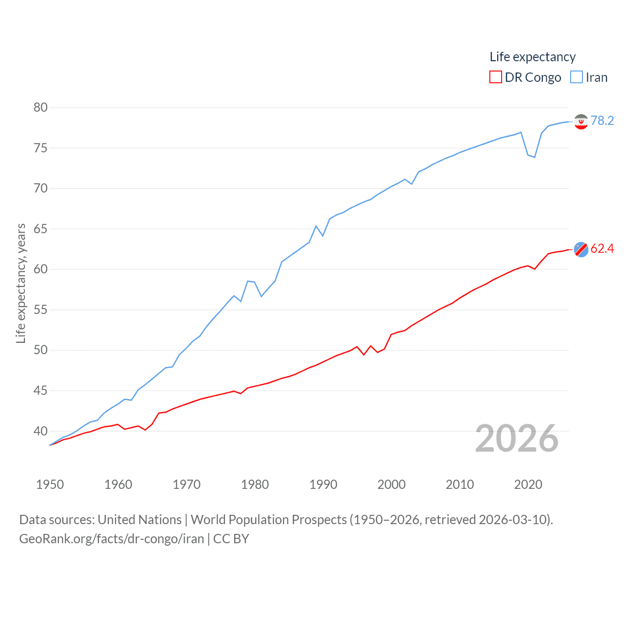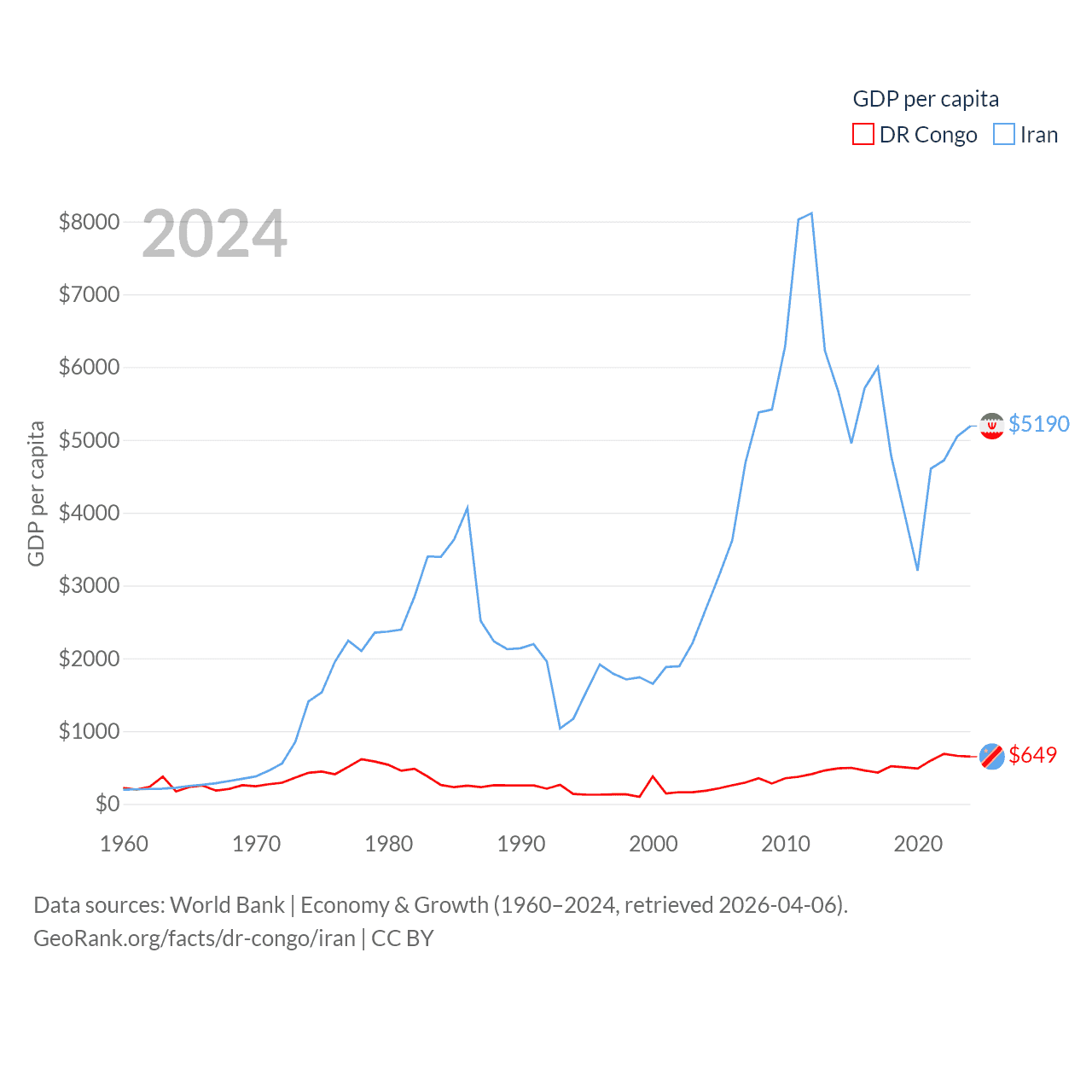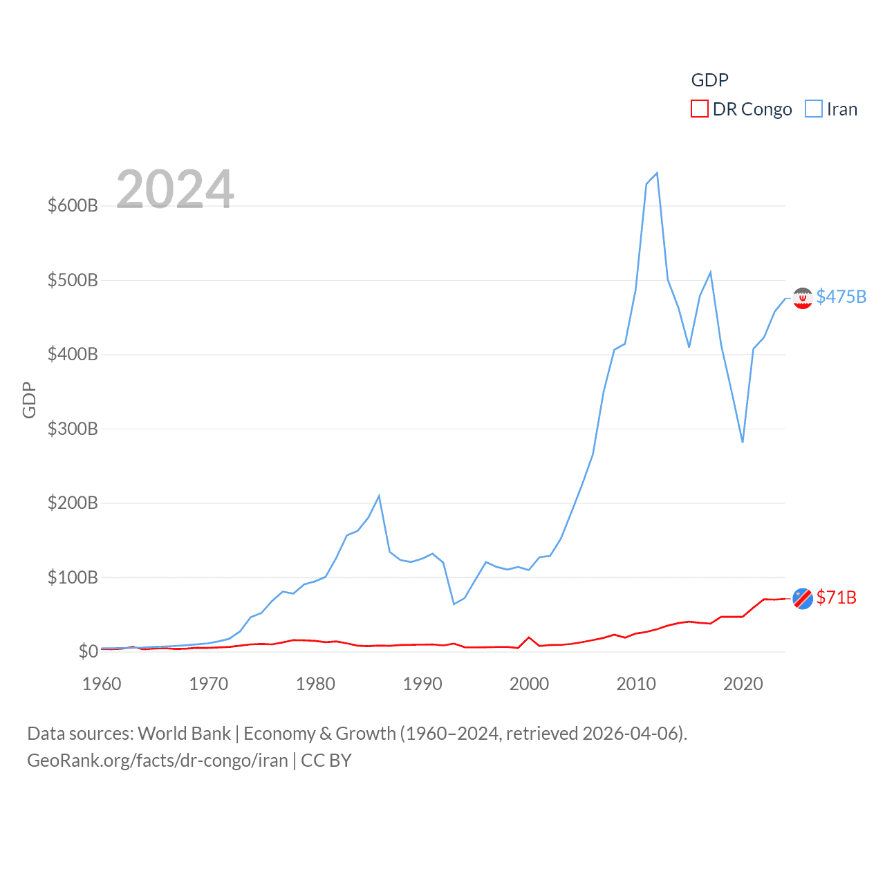 By GDP, The DR Congo ranks 87/197 ($71B) and Iran ranks 34/197 ($475B). By GDP per capita, The DR Congo ranks 190/197 ($649), while Iran ranks 119/197 ($5,190).