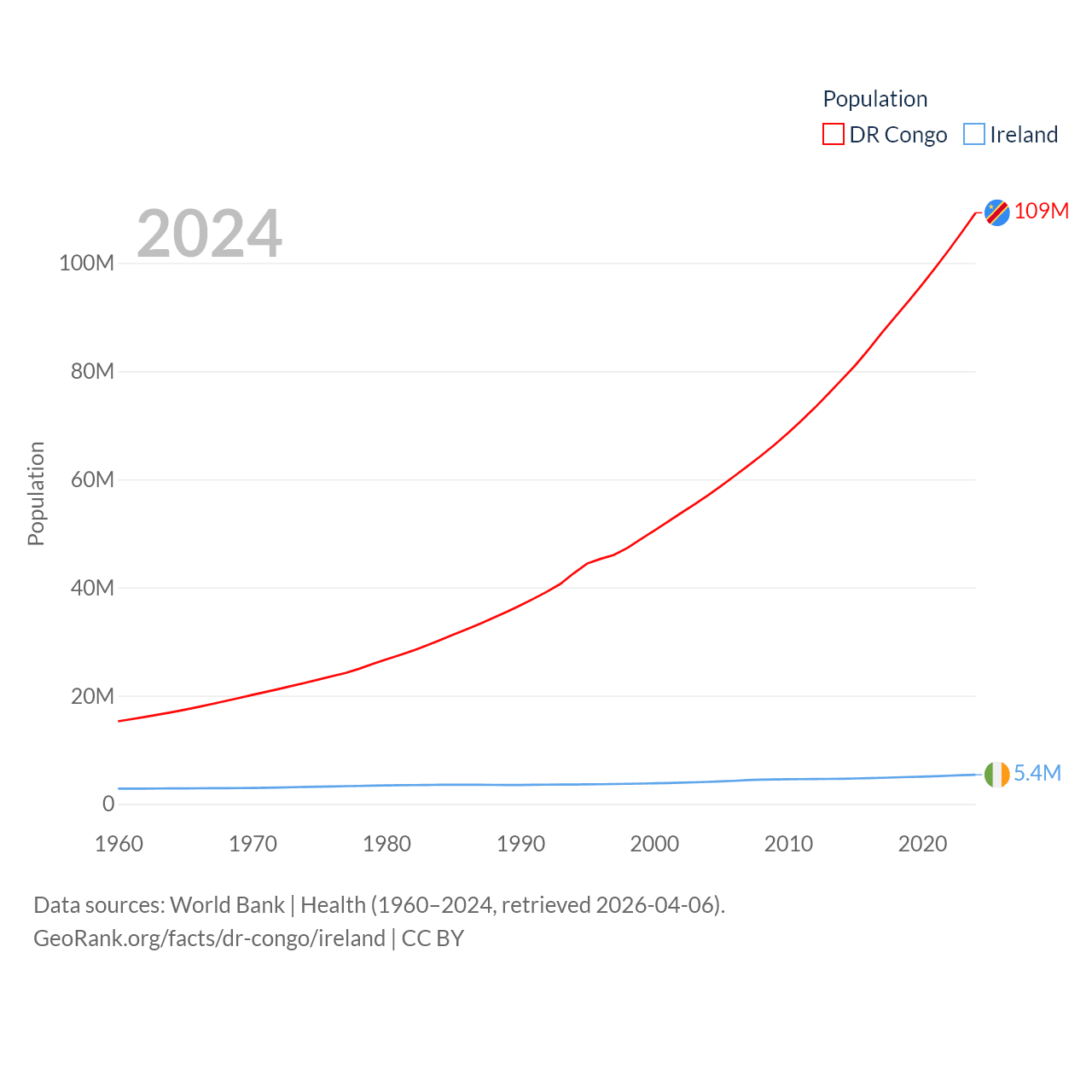 The DR Congo has a population of 109M (ranked 15/197), compared with 5.4M in Ireland (ranked 120/197). The DR Congo's land area is 875,313 sq mi versus 26,599 sq mi for Ireland (ranked 11th vs. 119th).