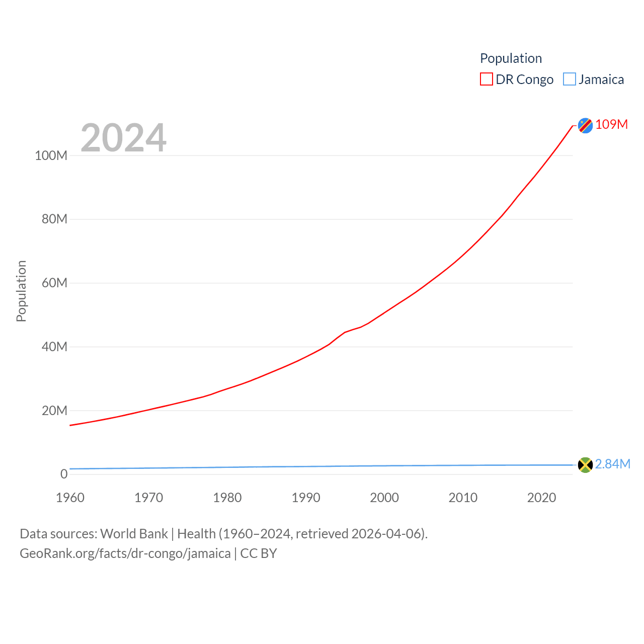 The DR Congo has a population of 109M (ranked 15/197), compared with 2.84M in Jamaica (ranked 139/197). The DR Congo's land area is 875,313 sq mi versus 4,181 sq mi for Jamaica (ranked 11th vs. 159th).