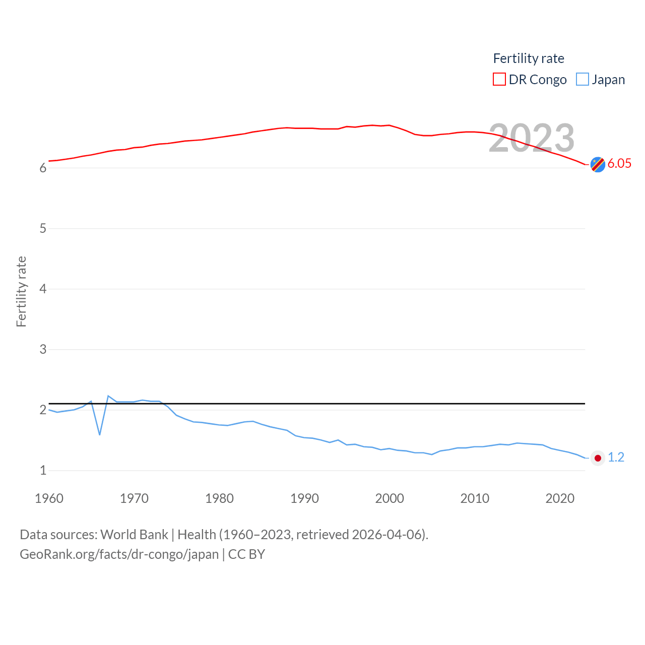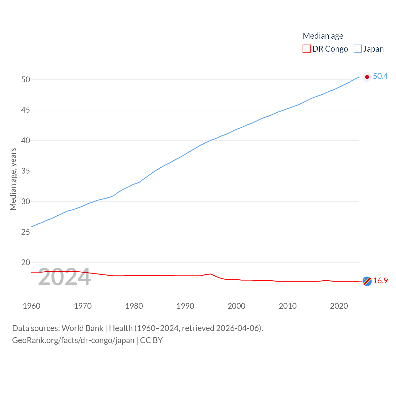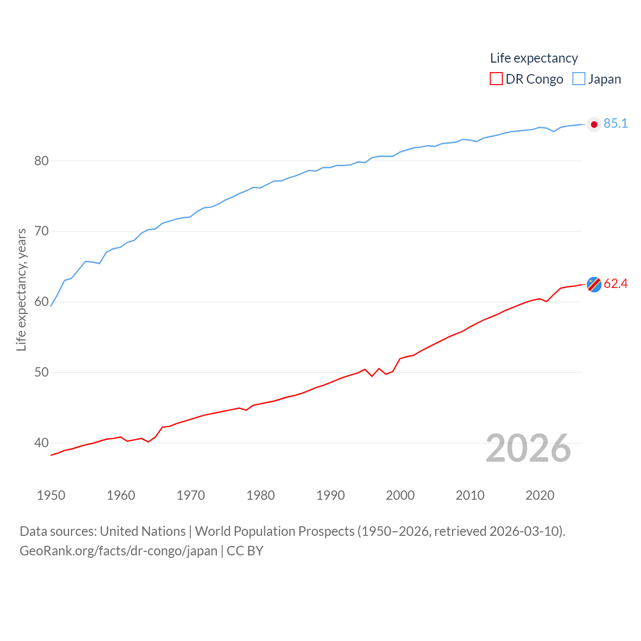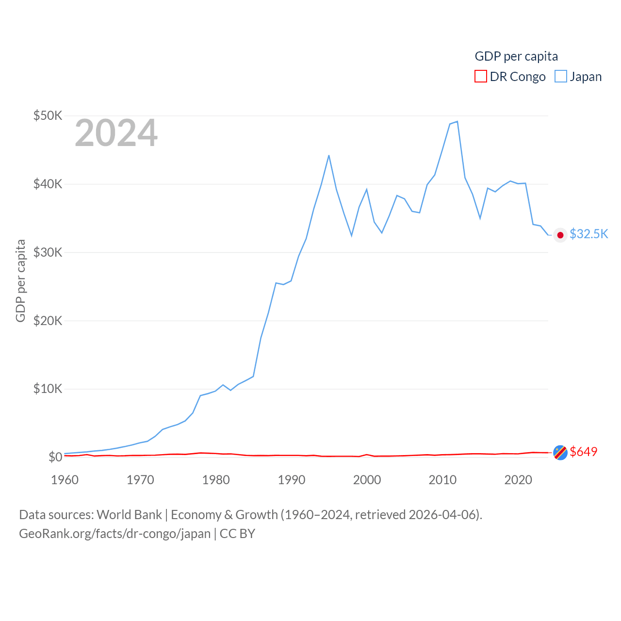 By GDP, The DR Congo ranks 87/197 ($71B) and Japan ranks 4/197 ($4.03T). By GDP per capita, The DR Congo ranks 190/197 ($649), while Japan ranks 38/197 ($32,487).