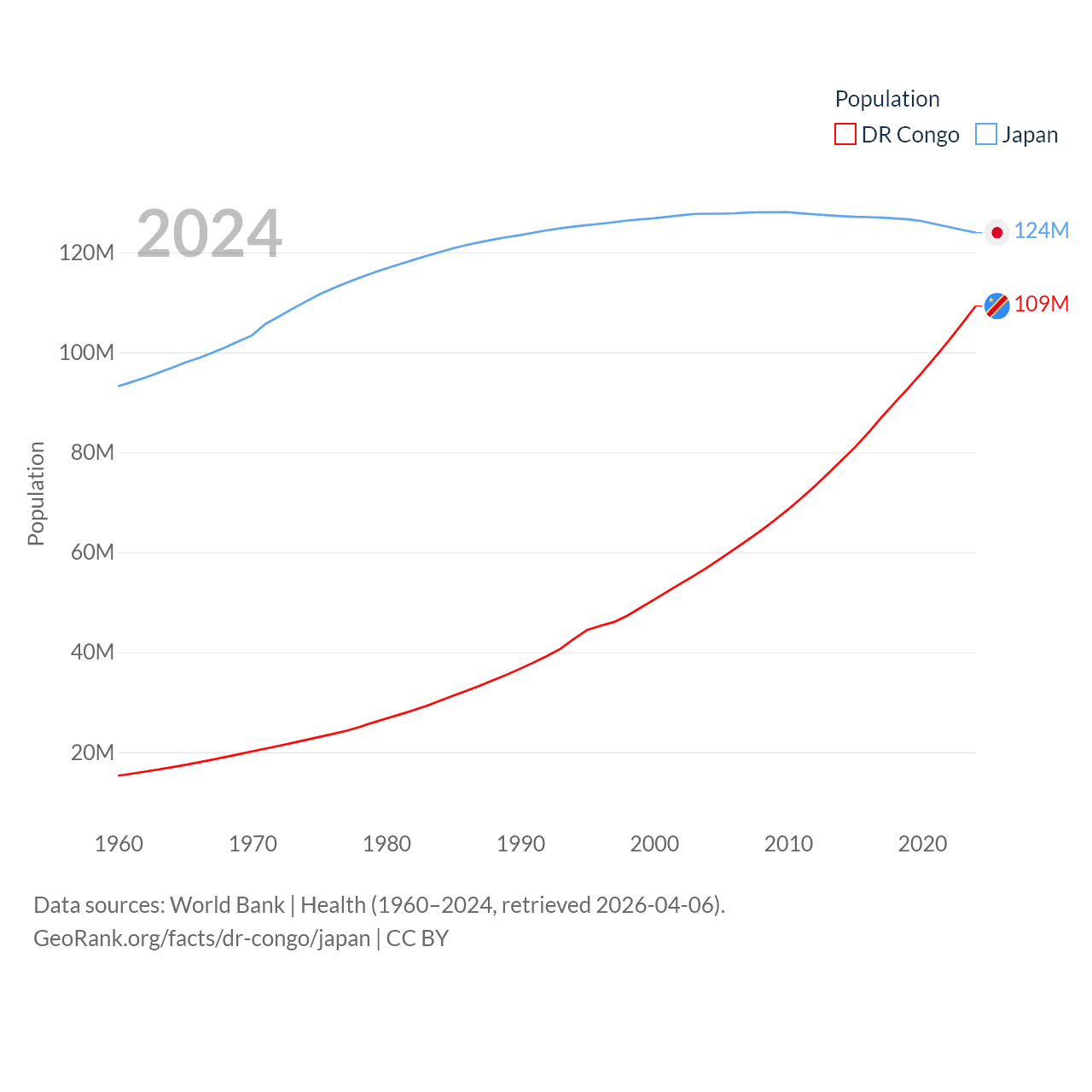 The DR Congo has a population of 109M (ranked 15/197), compared with 124M in Japan (ranked 12/197). The DR Congo's land area is 875,313 sq mi versus 140,761 sq mi for Japan (ranked 11th vs. 61st).