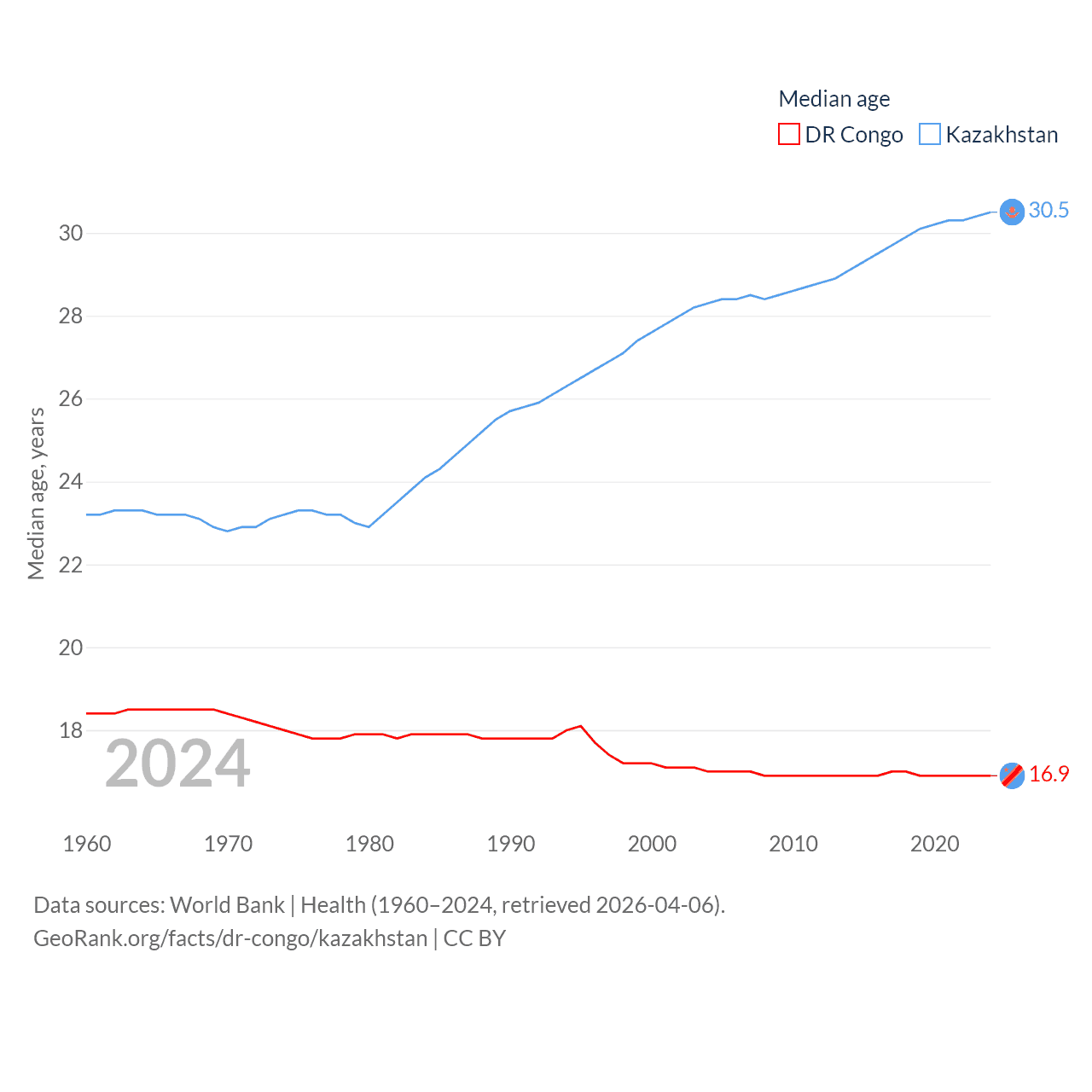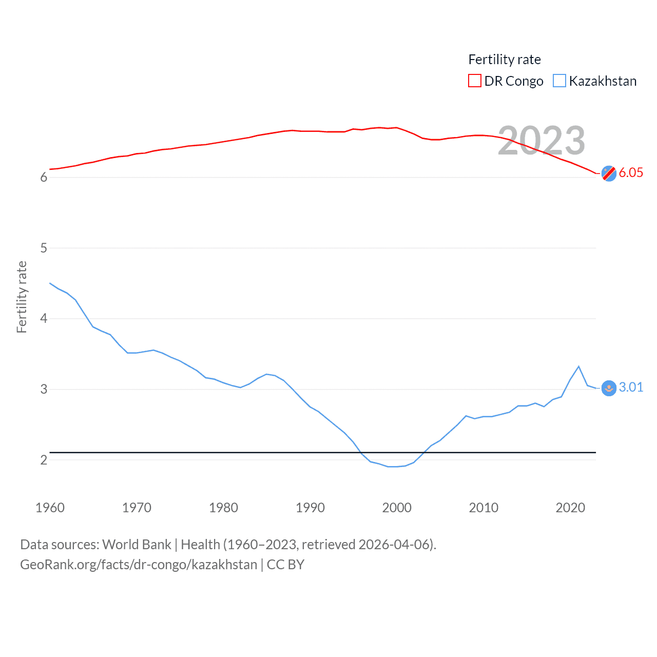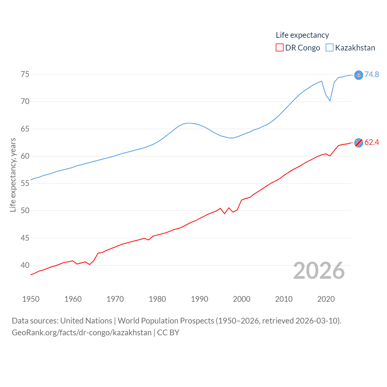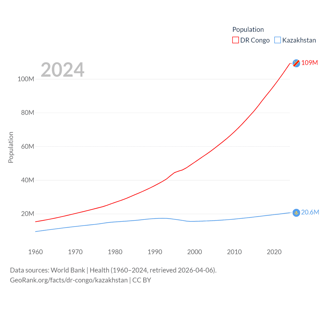 The DR Congo has a population of 109M (ranked 15/197), compared with 20.6M in Kazakhstan (ranked 64/197). The DR Congo's land area is 875,313 sq mi versus 1,042,360 sq mi for Kazakhstan (ranked 11th vs. 9th).