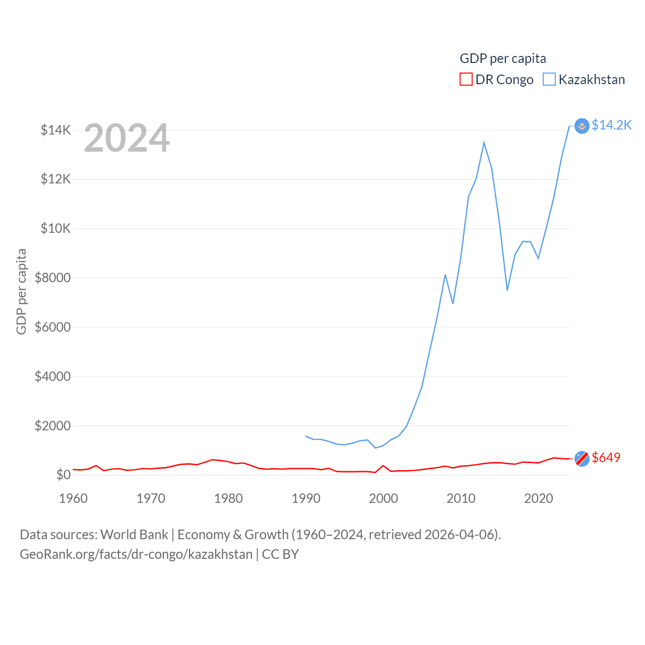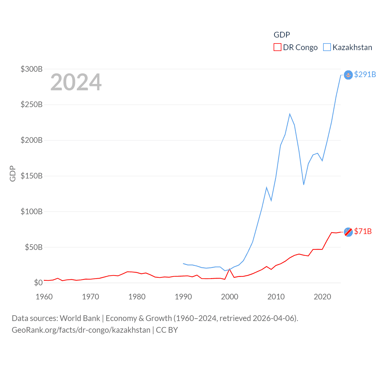 By GDP, The DR Congo ranks 87/197 ($71B) and Kazakhstan ranks 48/197 ($291B). By GDP per capita, The DR Congo ranks 190/197 ($649), while Kazakhstan ranks 71/197 ($14,155).