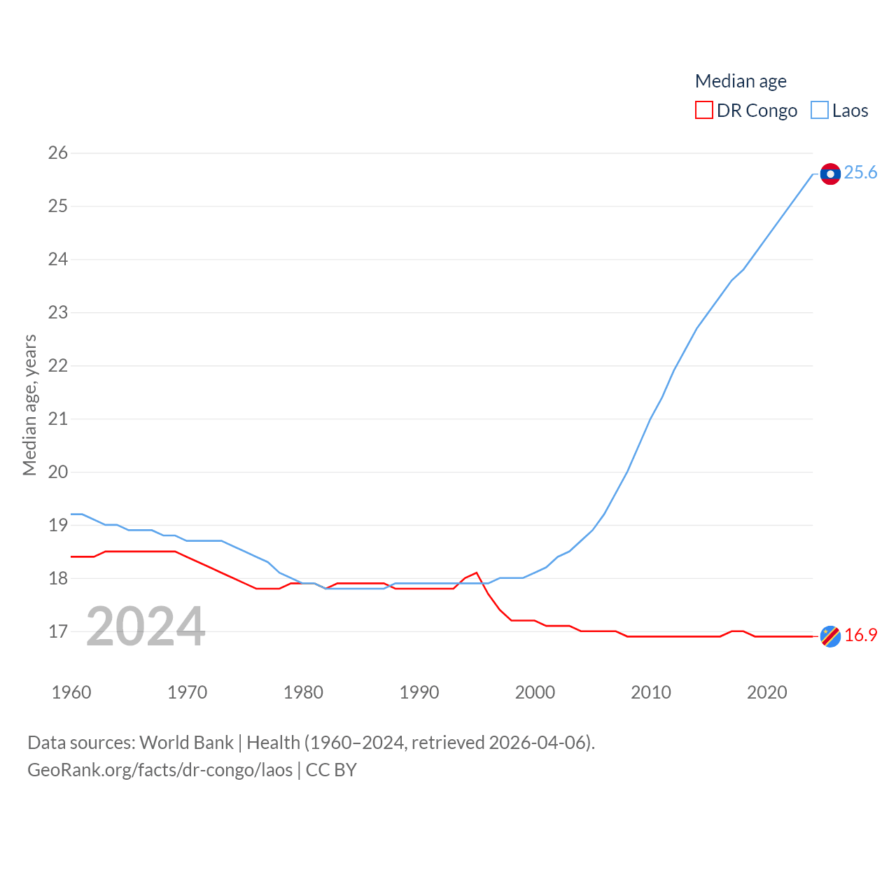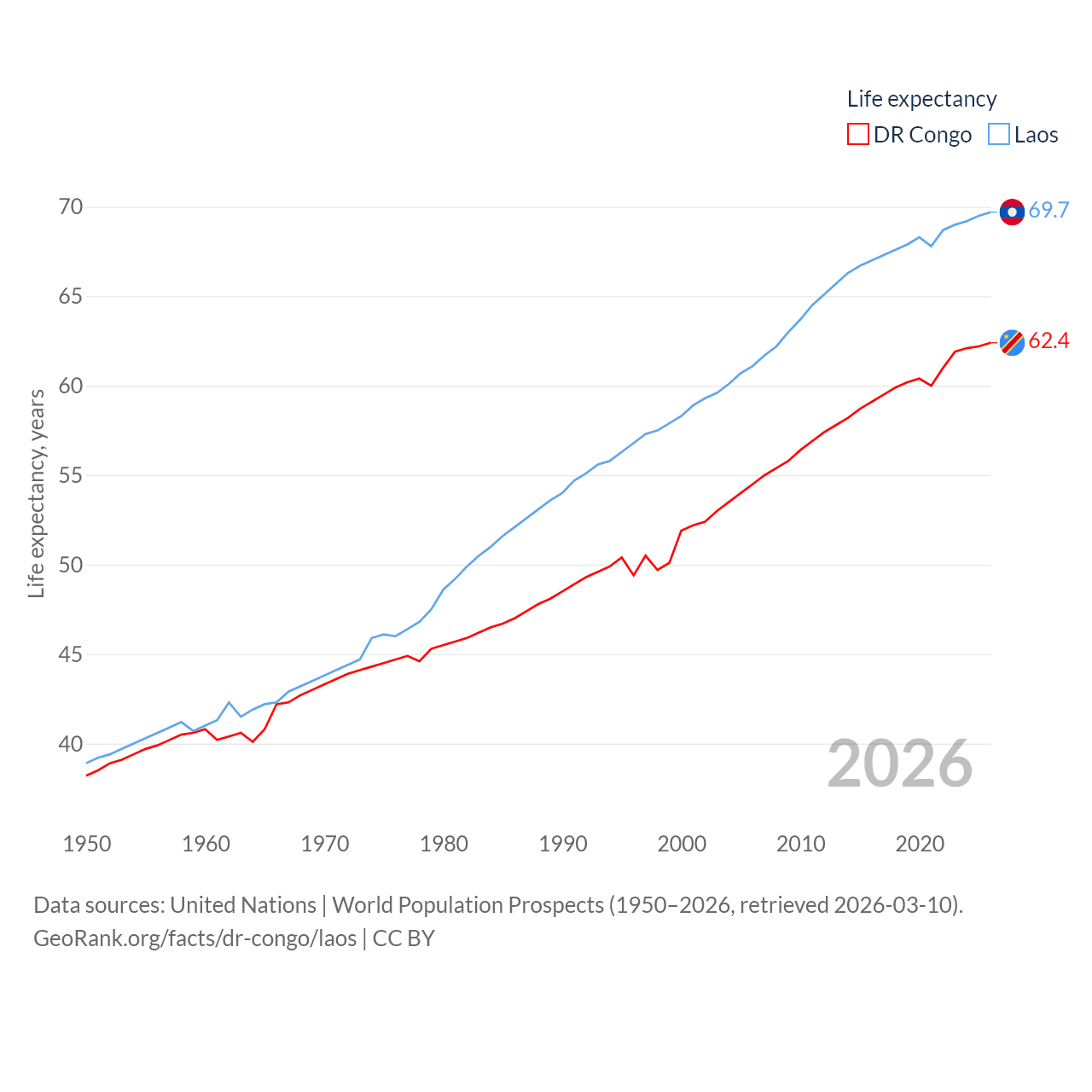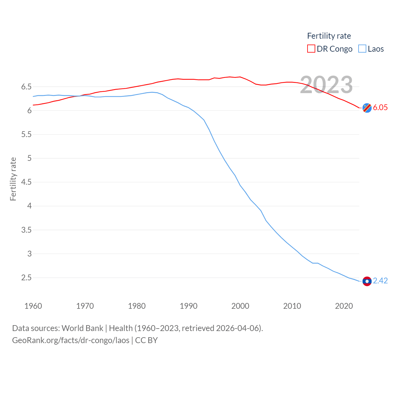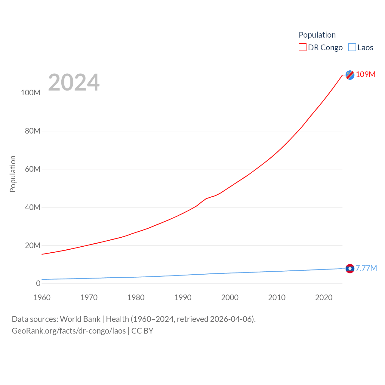 The DR Congo has a population of 109M (ranked 15/197), compared with 7.77M in Laos (ranked 103/197). The DR Congo's land area is 875,313 sq mi versus 89,112 sq mi for Laos (ranked 11th vs. 79th).