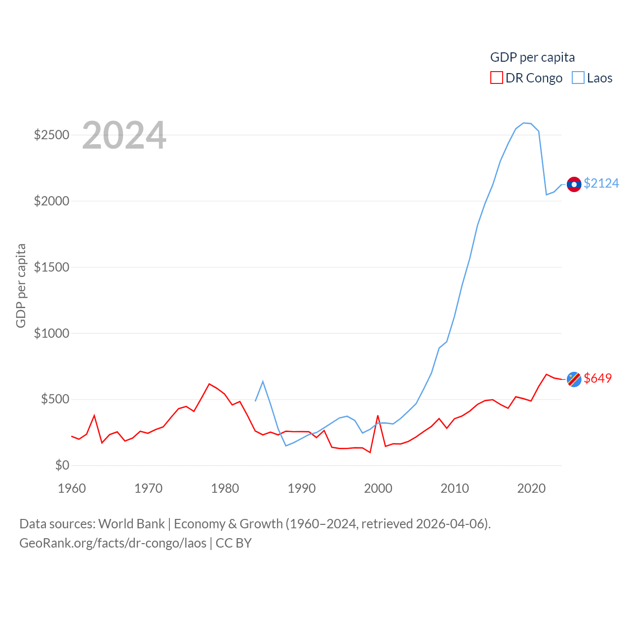 By GDP, The DR Congo ranks 87/197 ($71B) and Laos ranks 139/197 ($16.5B). By GDP per capita, The DR Congo ranks 190/197 ($649), while Laos ranks 155/197 ($2,124).