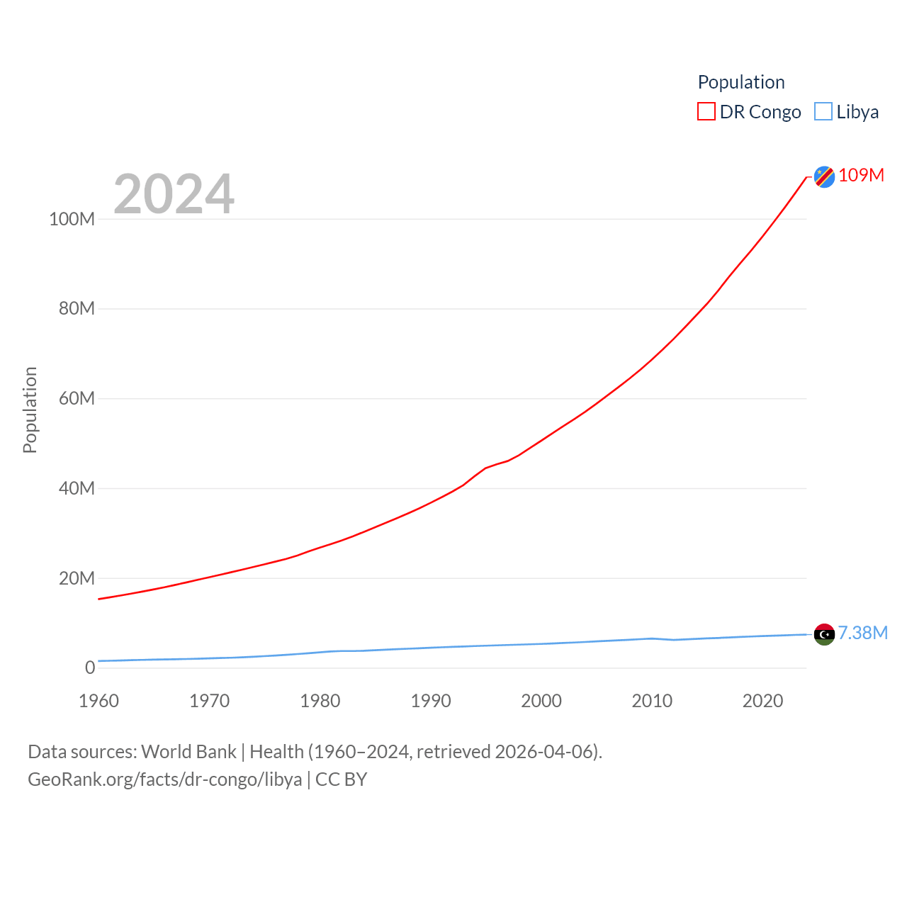 The DR Congo has a population of 109M (ranked 15/197), compared with 7.38M in Libya (ranked 105/197). The DR Congo's land area is 875,313 sq mi versus 679,362 sq mi for Libya (ranked 11th vs. 16th).