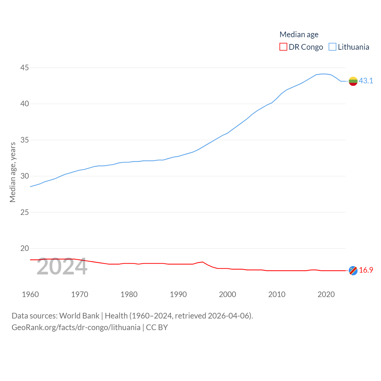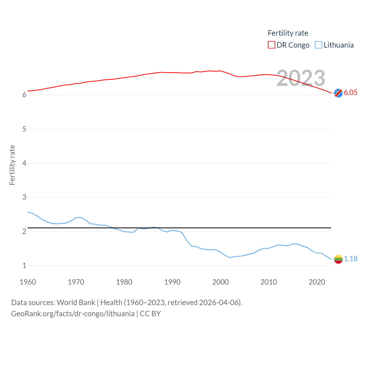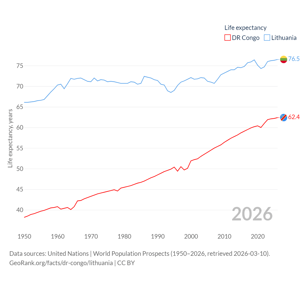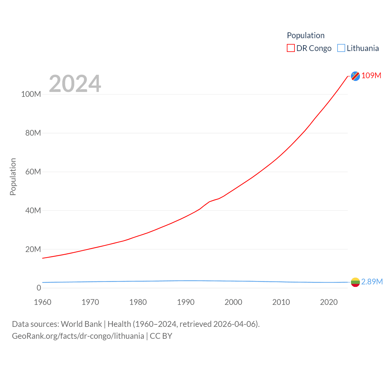 The DR Congo has a population of 109M (ranked 15/197), compared with 2.89M in Lithuania (ranked 137/197). The DR Congo's land area is 875,313 sq mi versus 24,170 sq mi for Lithuania (ranked 11th vs. 120th).