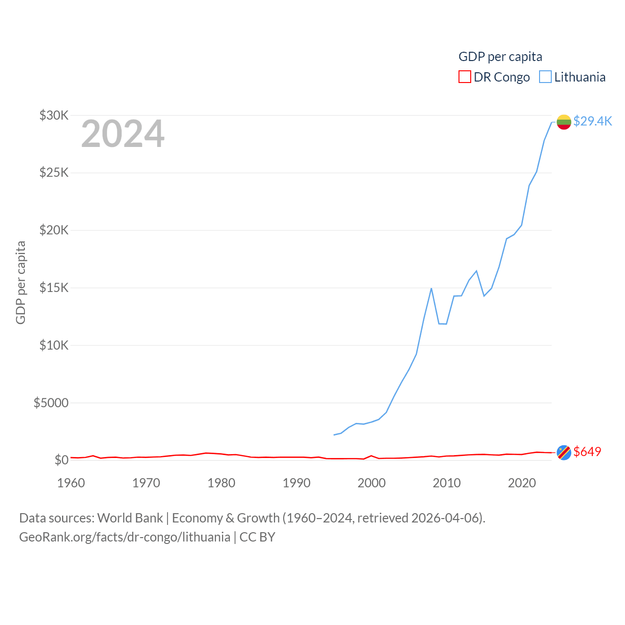 By GDP, The DR Congo ranks 87/197 ($71B) and Lithuania ranks 79/197 ($84.9B). By GDP per capita, The DR Congo ranks 190/197 ($649), while Lithuania ranks 43/197 ($29,384).