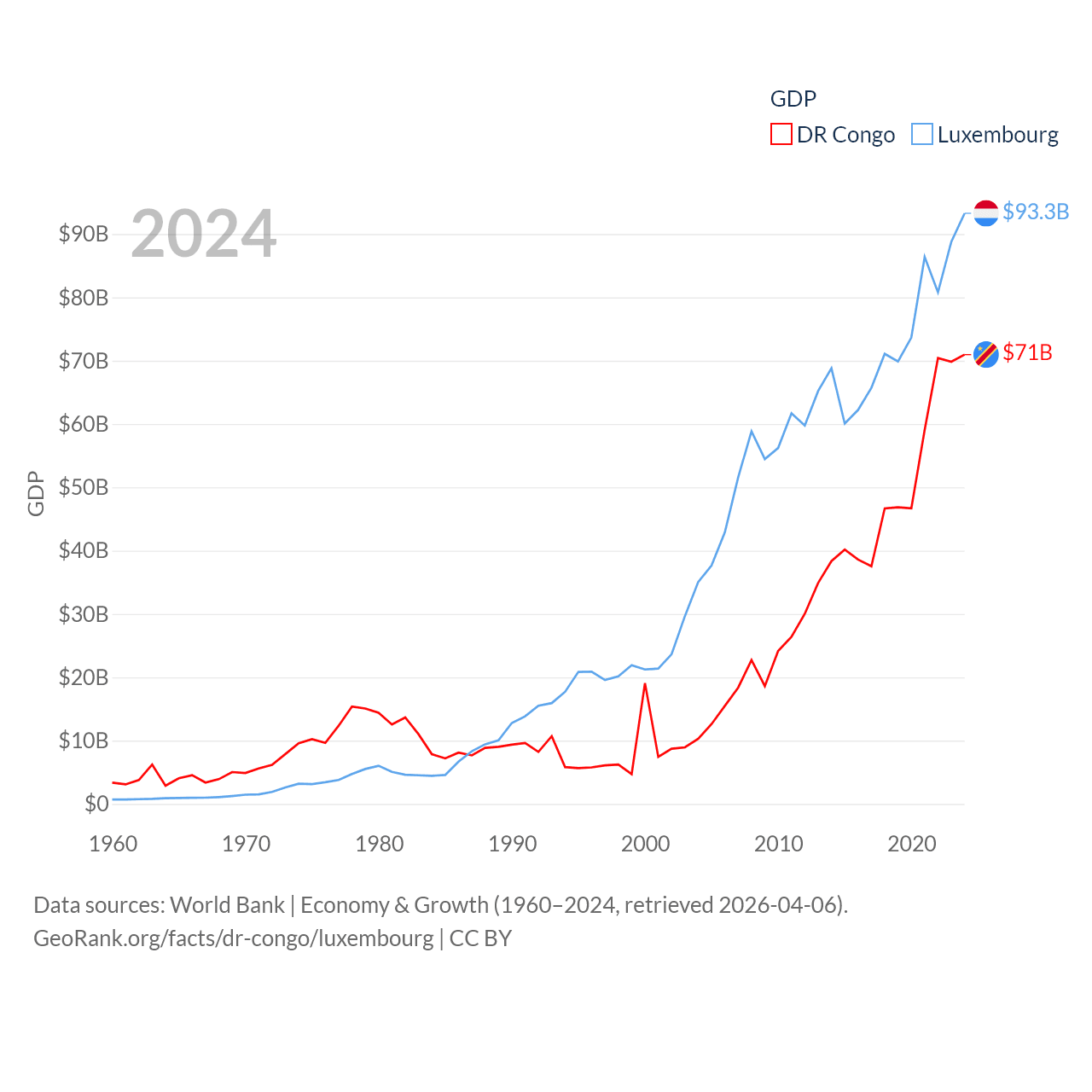 By GDP, The DR Congo ranks 87/197 ($71B) and Luxembourg ranks 74/197 ($93.3B). By GDP per capita, The DR Congo ranks 190/197 ($649), while Luxembourg ranks 3/197 ($137,782).