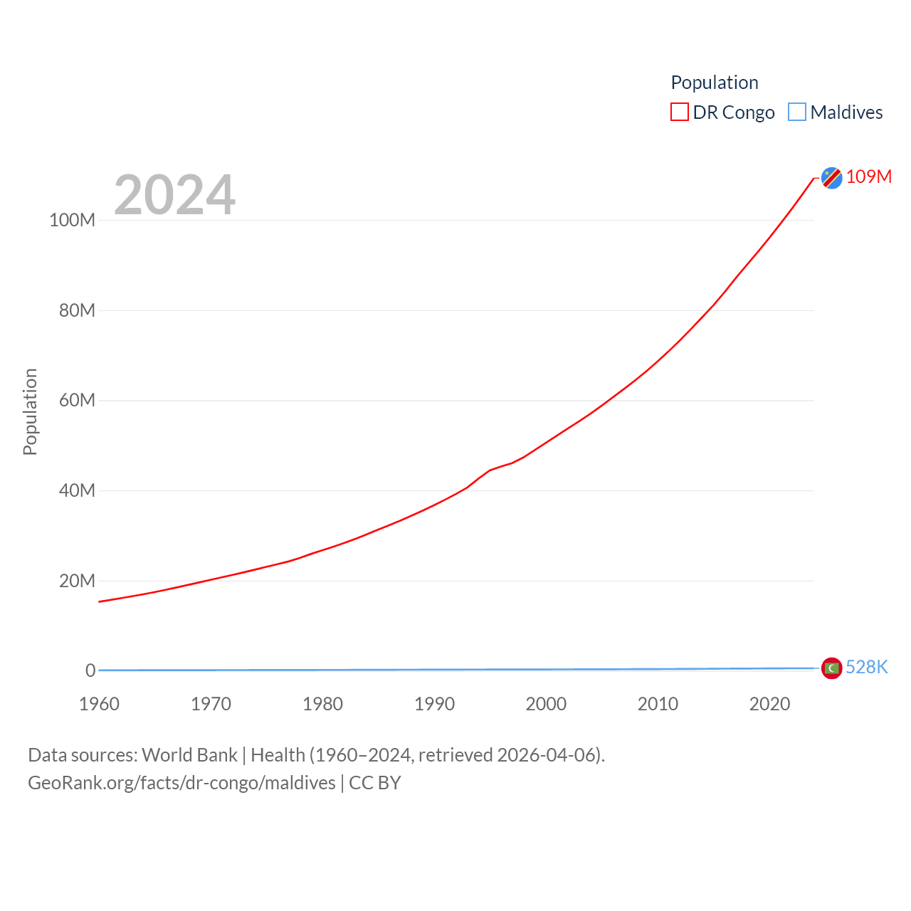 The DR Congo has a population of 109M (ranked 15/197), compared with 528K in Maldives (ranked 168/197). The DR Congo's land area is 875,313 sq mi versus 115.1 sq mi for Maldives (ranked 11th vs. 188th).