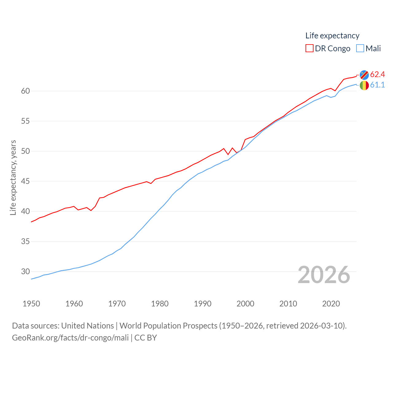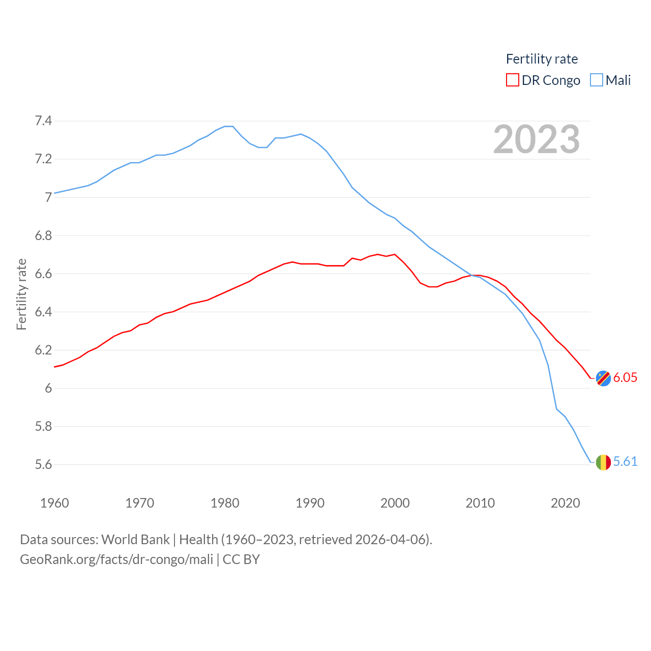 The DR Congo has a population of 109M (ranked 15/197), compared with 24.5M in Mali (ranked 58/197). The DR Congo's land area is 875,313 sq mi versus 471,118 sq mi for Mali (ranked 11th vs. 23rd).