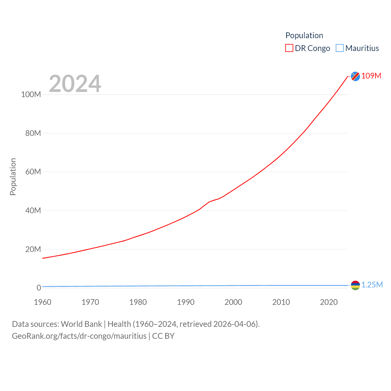 The DR Congo has a population of 109M (ranked 15/197), compared with 1.25M in Mauritius (ranked 156/197). The DR Congo's land area is 875,313 sq mi versus 771 sq mi for Mauritius (ranked 11th vs. 170th).