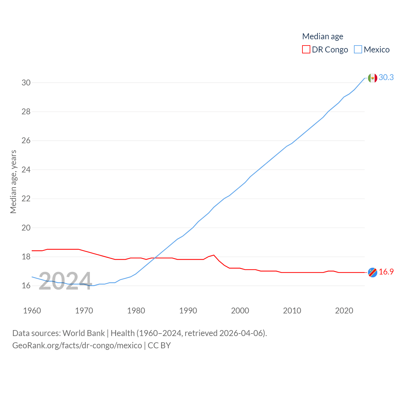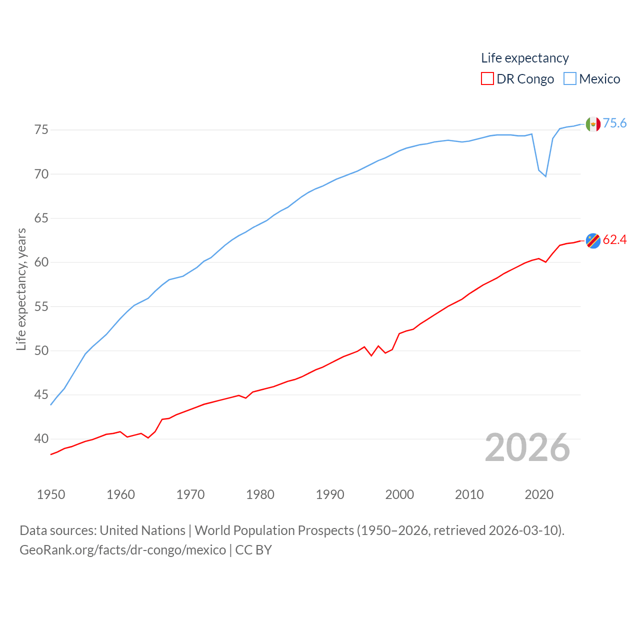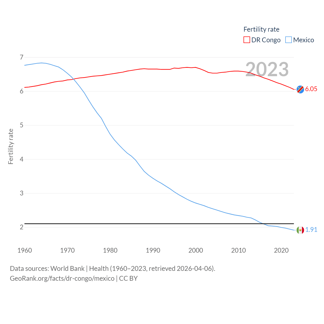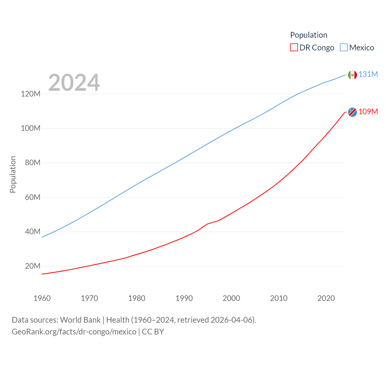 The DR Congo has a population of 109M (ranked 15/197), compared with 131M in Mexico (ranked 11/197). The DR Congo's land area is 875,313 sq mi versus 750,563 sq mi for Mexico (ranked 11th vs. 13th).