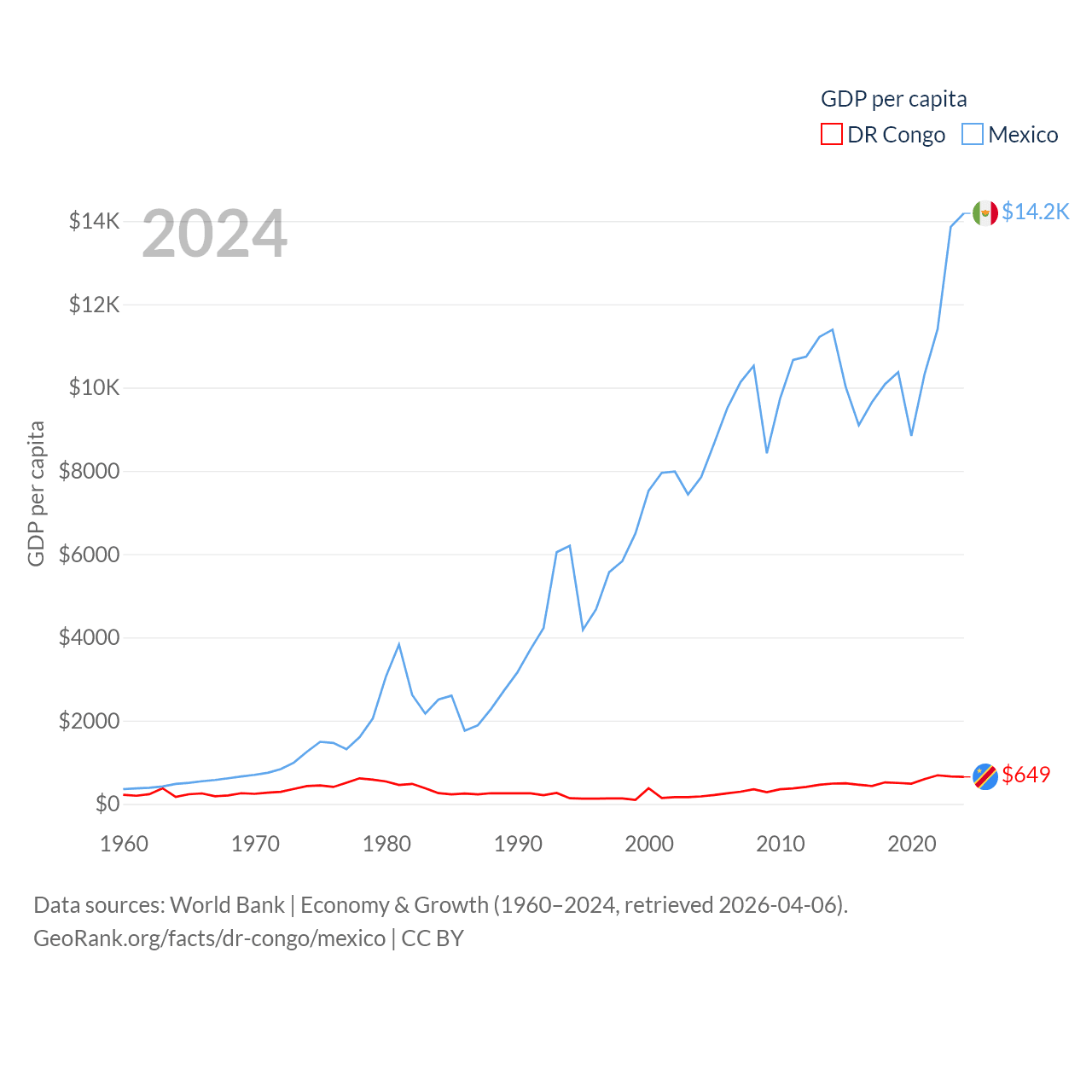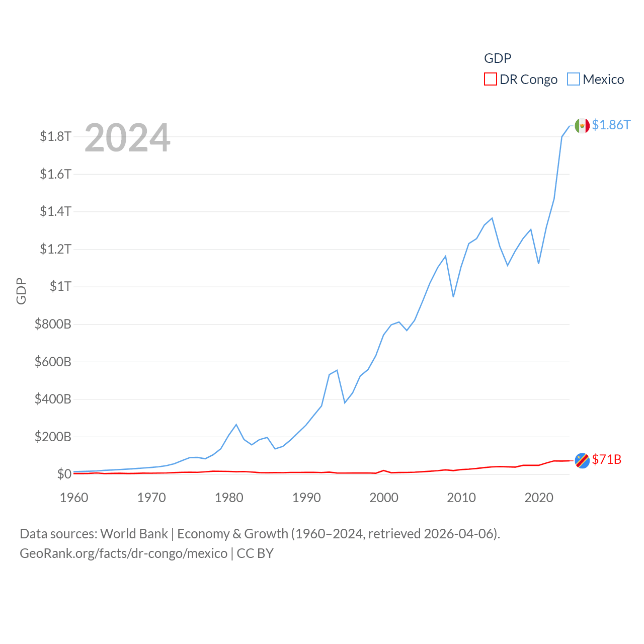 By GDP, The DR Congo ranks 87/197 ($71B) and Mexico ranks 13/197 ($1.86T). By GDP per capita, The DR Congo ranks 190/197 ($649), while Mexico ranks 69/197 ($14,186).