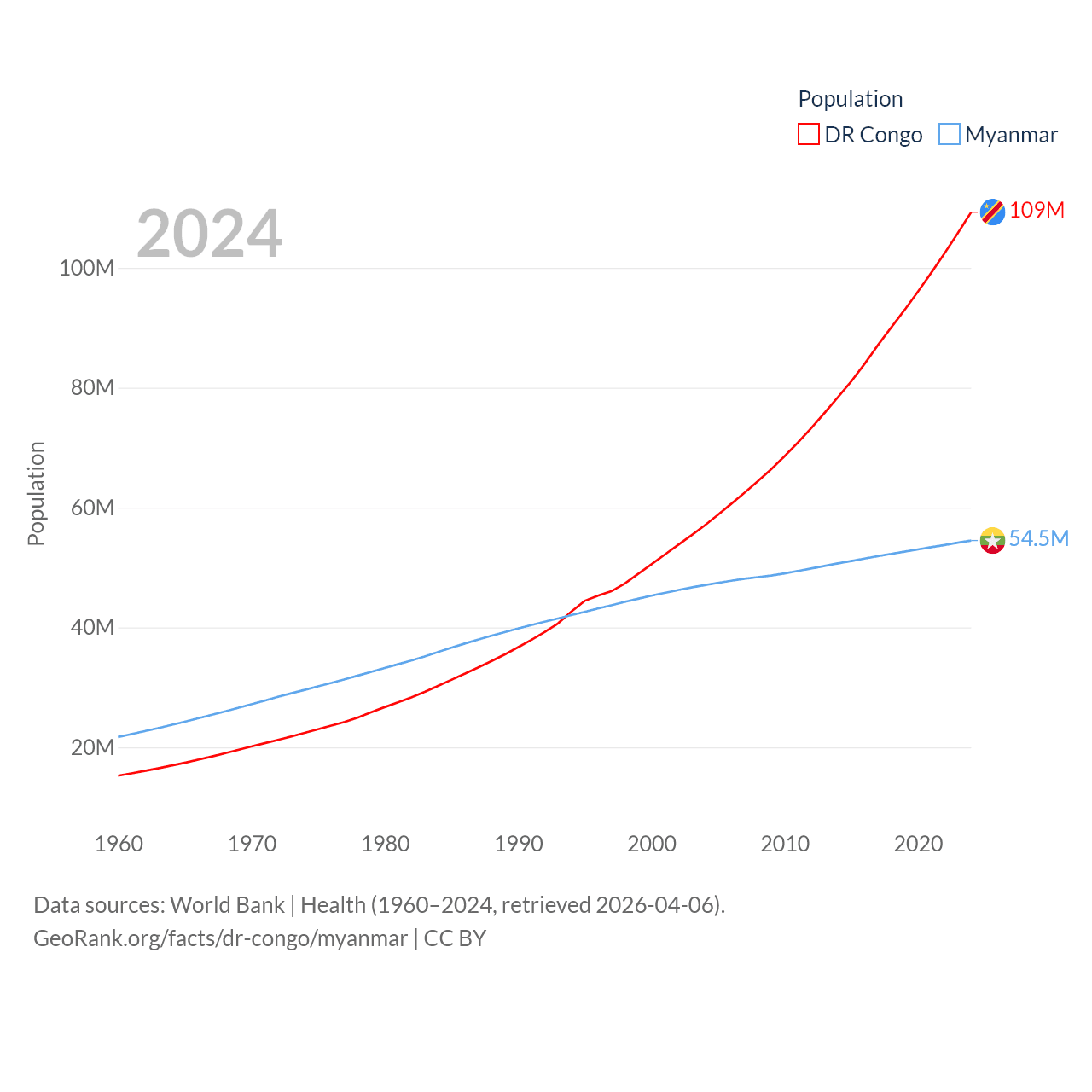 The DR Congo has a population of 109M (ranked 15/197), compared with 54.5M in Myanmar (ranked 27/197). The DR Congo's land area is 875,313 sq mi versus 251,997 sq mi for Myanmar (ranked 11th vs. 39th).
