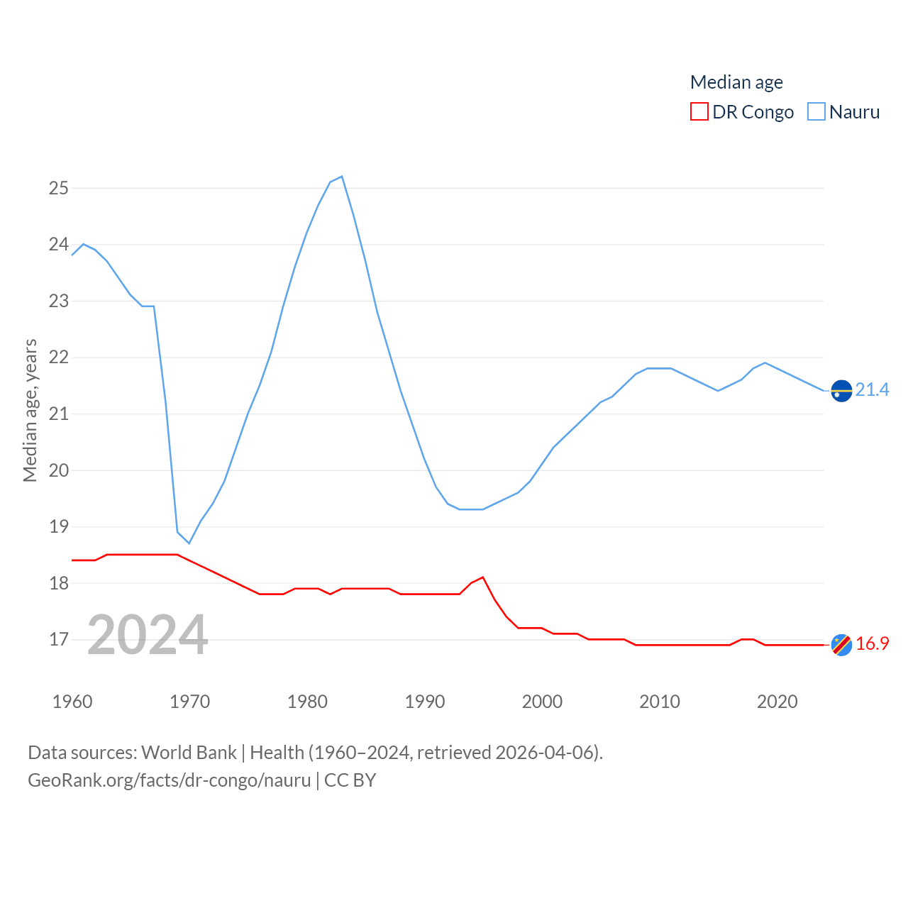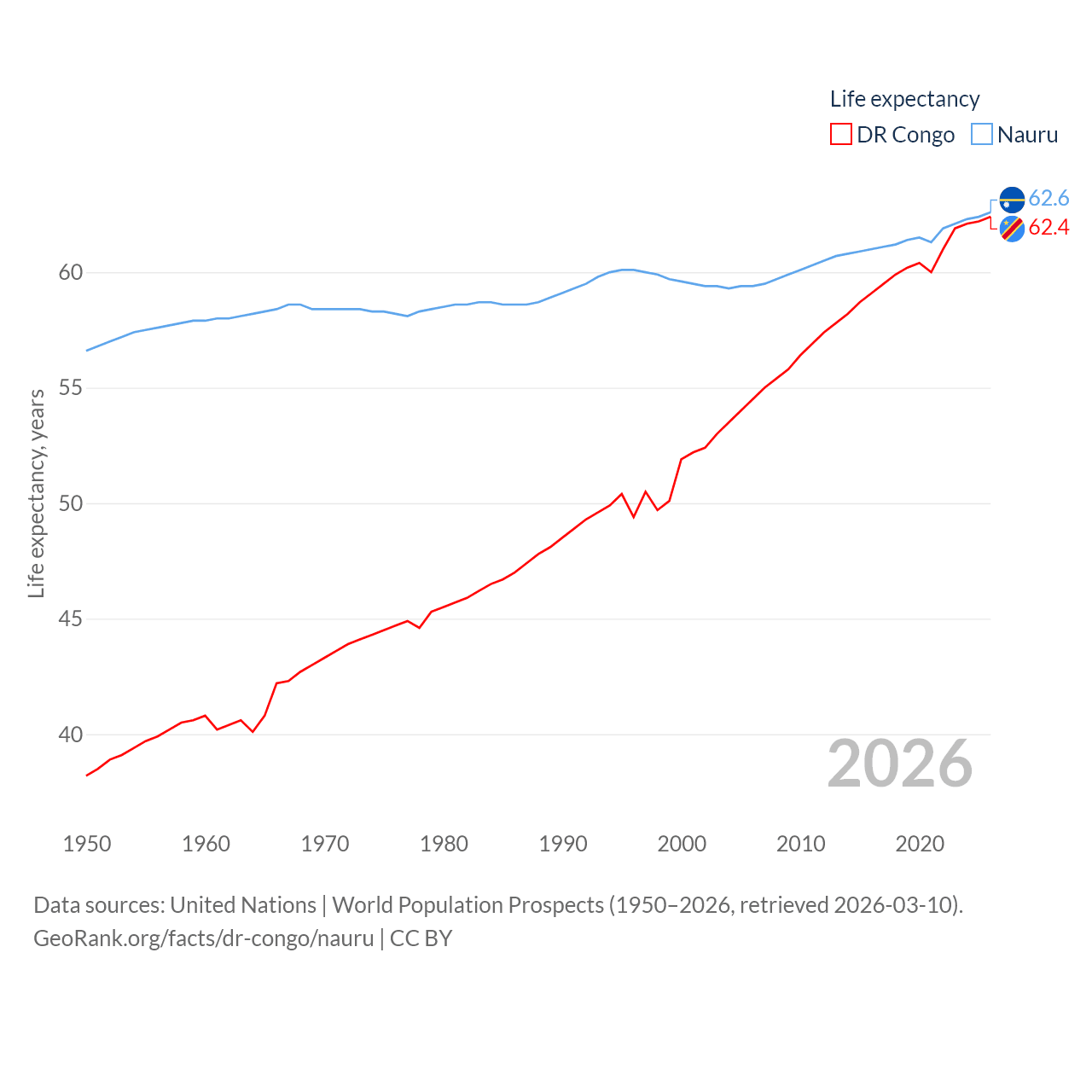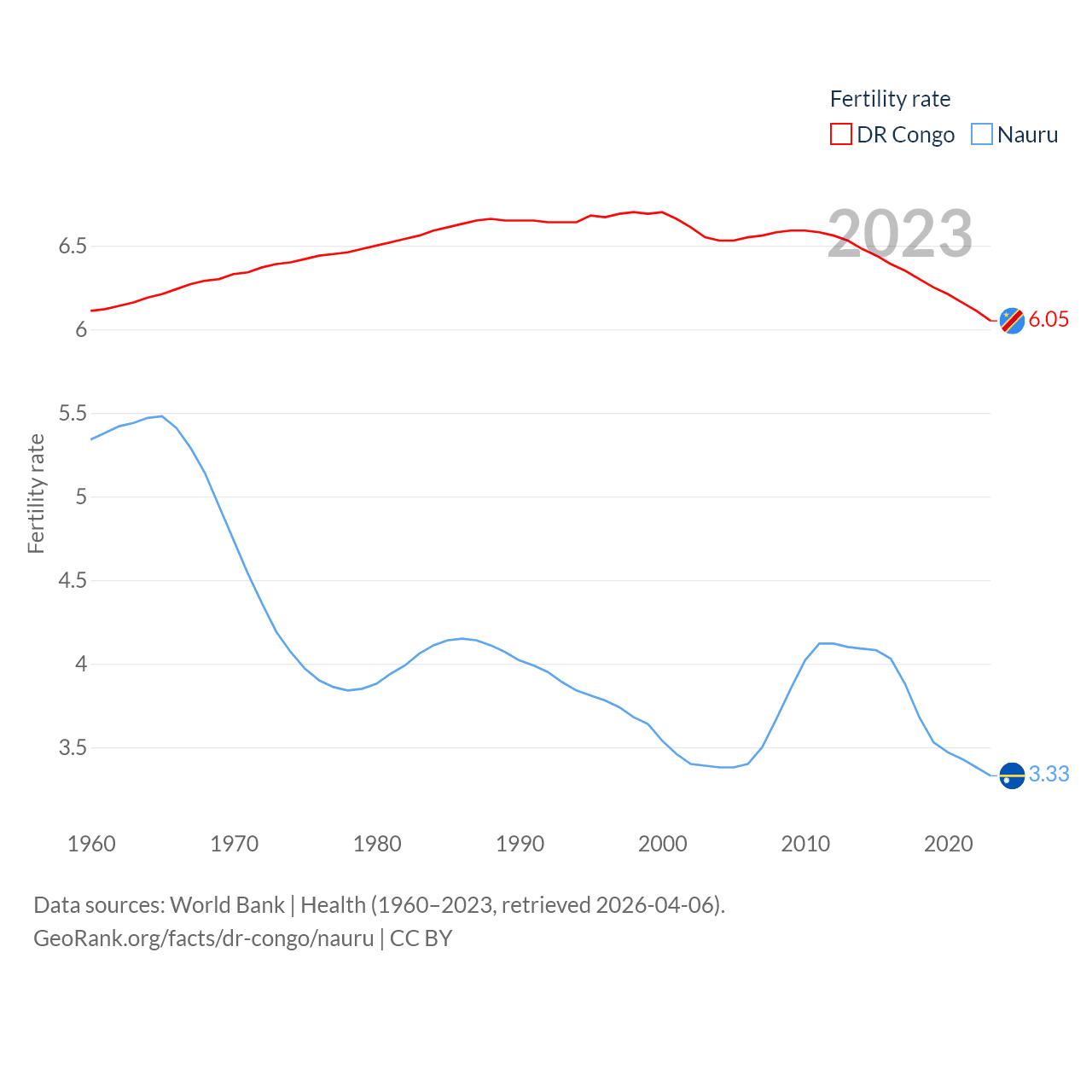 The DR Congo has a population of 109M (ranked 15/197), compared with 11.9K in Nauru (ranked 195/197). The DR Congo's land area is 875,313 sq mi versus 7.72 sq mi for Nauru (ranked 11th vs. 195th).