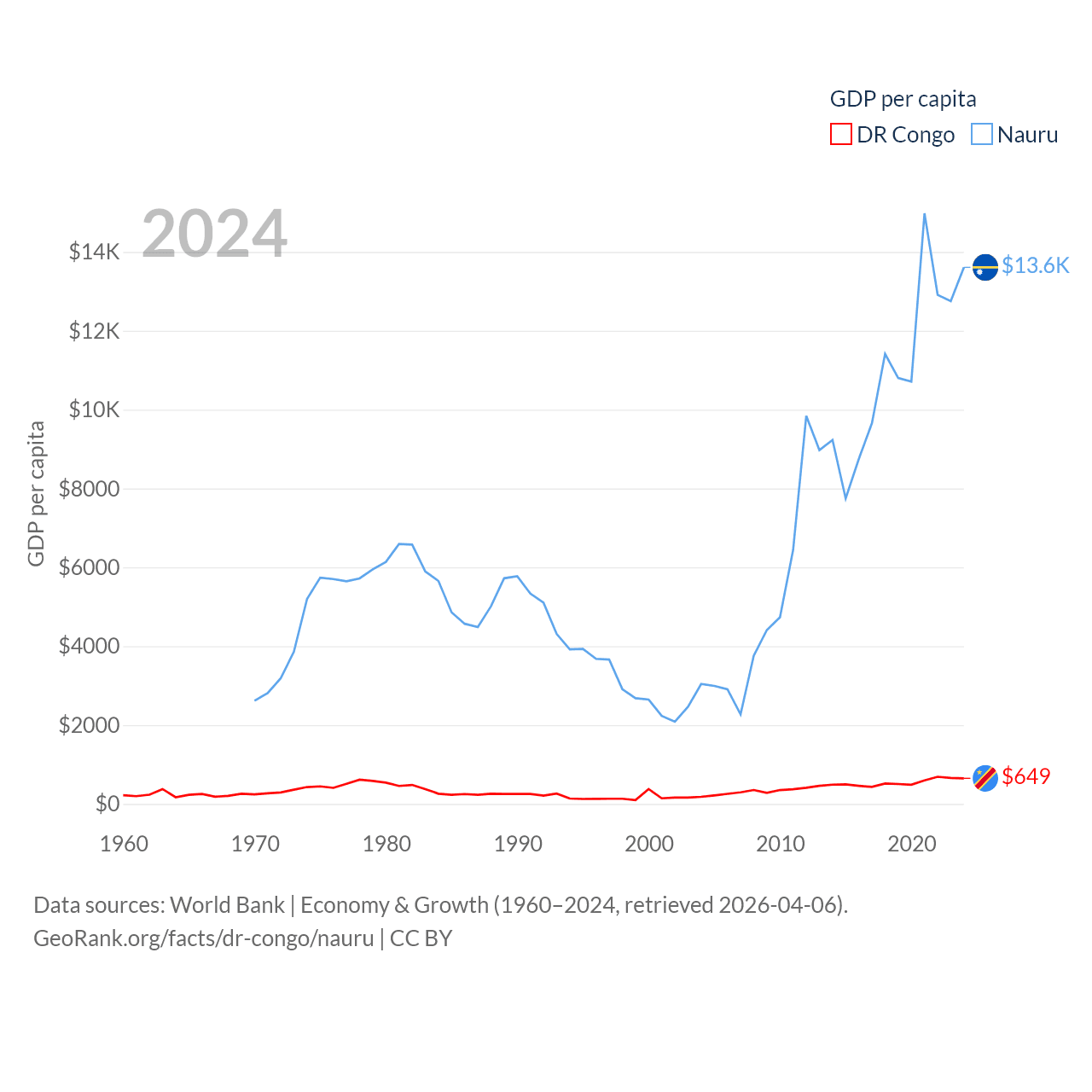 By GDP, The DR Congo ranks 87/197 ($71B) and Nauru ranks 195/197 ($163M). By GDP per capita, The DR Congo ranks 190/197 ($649), while Nauru ranks 74/197 ($13,609).