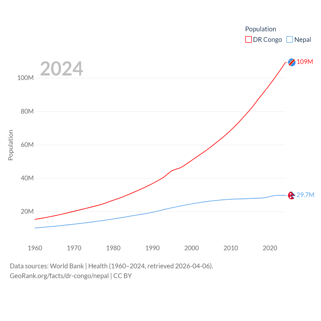 The DR Congo has a population of 109M (ranked 15/197), compared with 29.7M in Nepal (ranked 51/197). The DR Congo's land area is 875,313 sq mi versus 55,348 sq mi for Nepal (ranked 11th vs. 92nd).