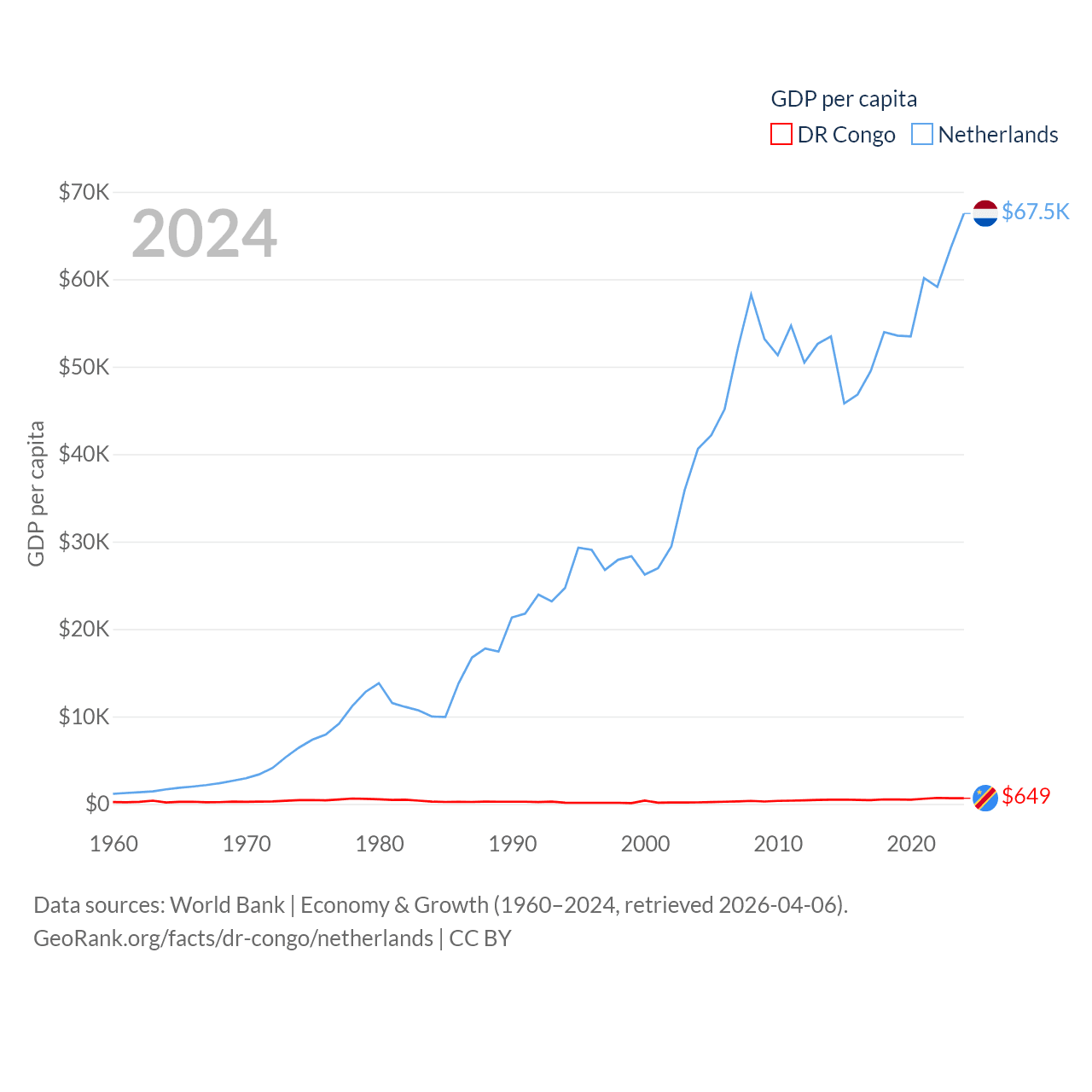 By GDP, The DR Congo ranks 87/197 ($71B) and The Netherlands ranks 19/197 ($1.21T). By GDP per capita, The DR Congo ranks 190/197 ($649), while The Netherlands ranks 13/197 ($67,520).