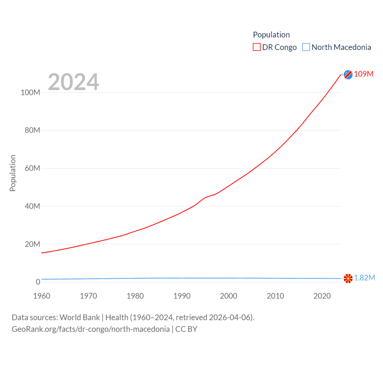 The DR Congo has a population of 109M (ranked 15/197), compared with 1.82M in North Macedonia (ranked 150/197). The DR Congo's land area is 875,313 sq mi versus 9,737 sq mi for North Macedonia (ranked 11th vs. 145th).