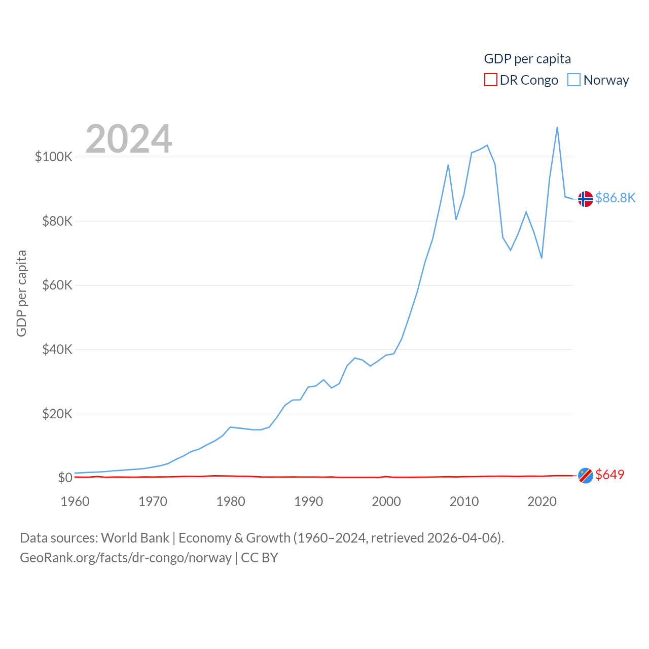 By GDP, The DR Congo ranks 87/197 ($71B) and Norway ranks 32/197 ($484B). By GDP per capita, The DR Congo ranks 190/197 ($649), while Norway ranks 8/197 ($86,785).
