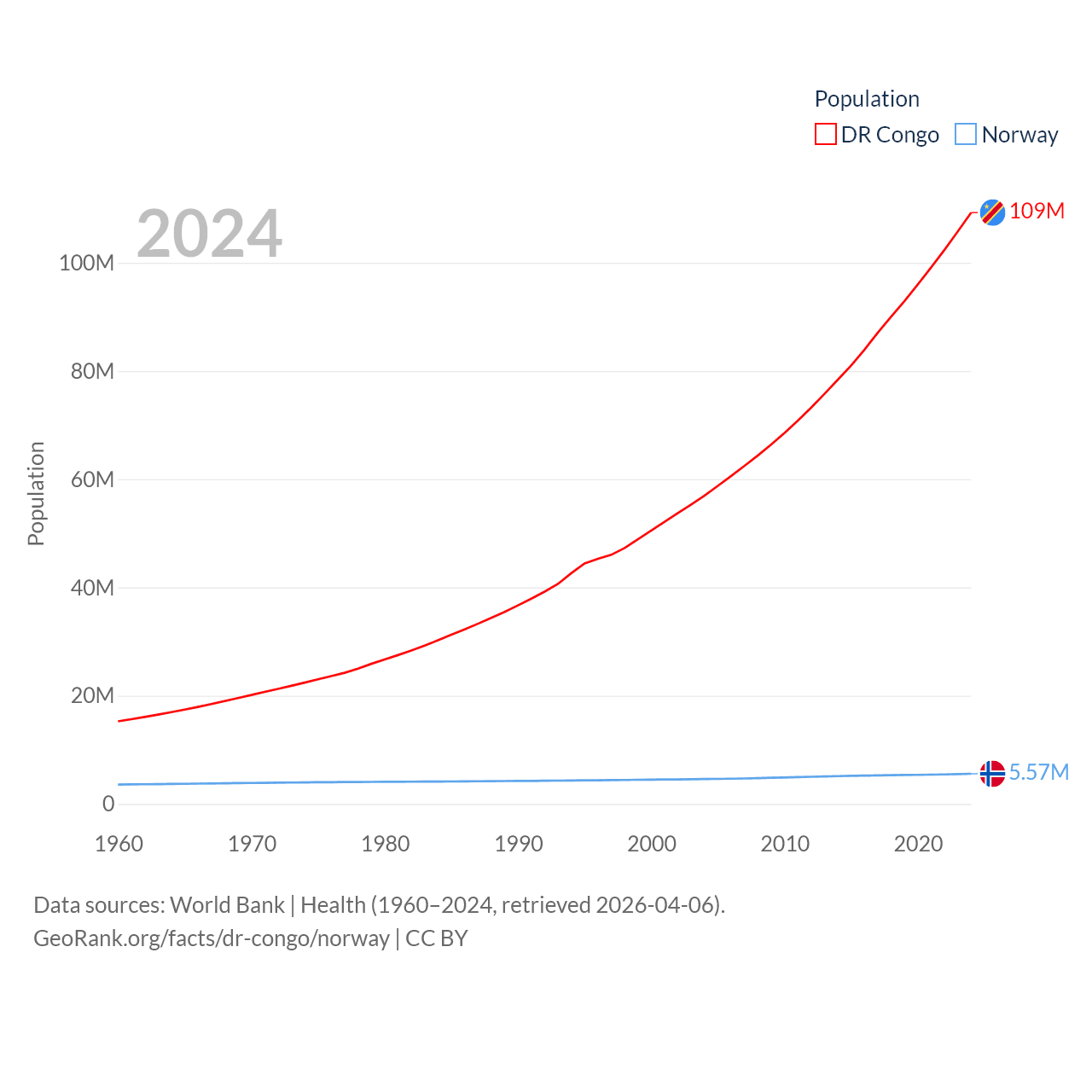 The DR Congo has a population of 109M (ranked 15/197), compared with 5.57M in Norway (ranked 118/197). The DR Congo's land area is 875,313 sq mi versus 140,645 sq mi for Norway (ranked 11th vs. 62nd).
