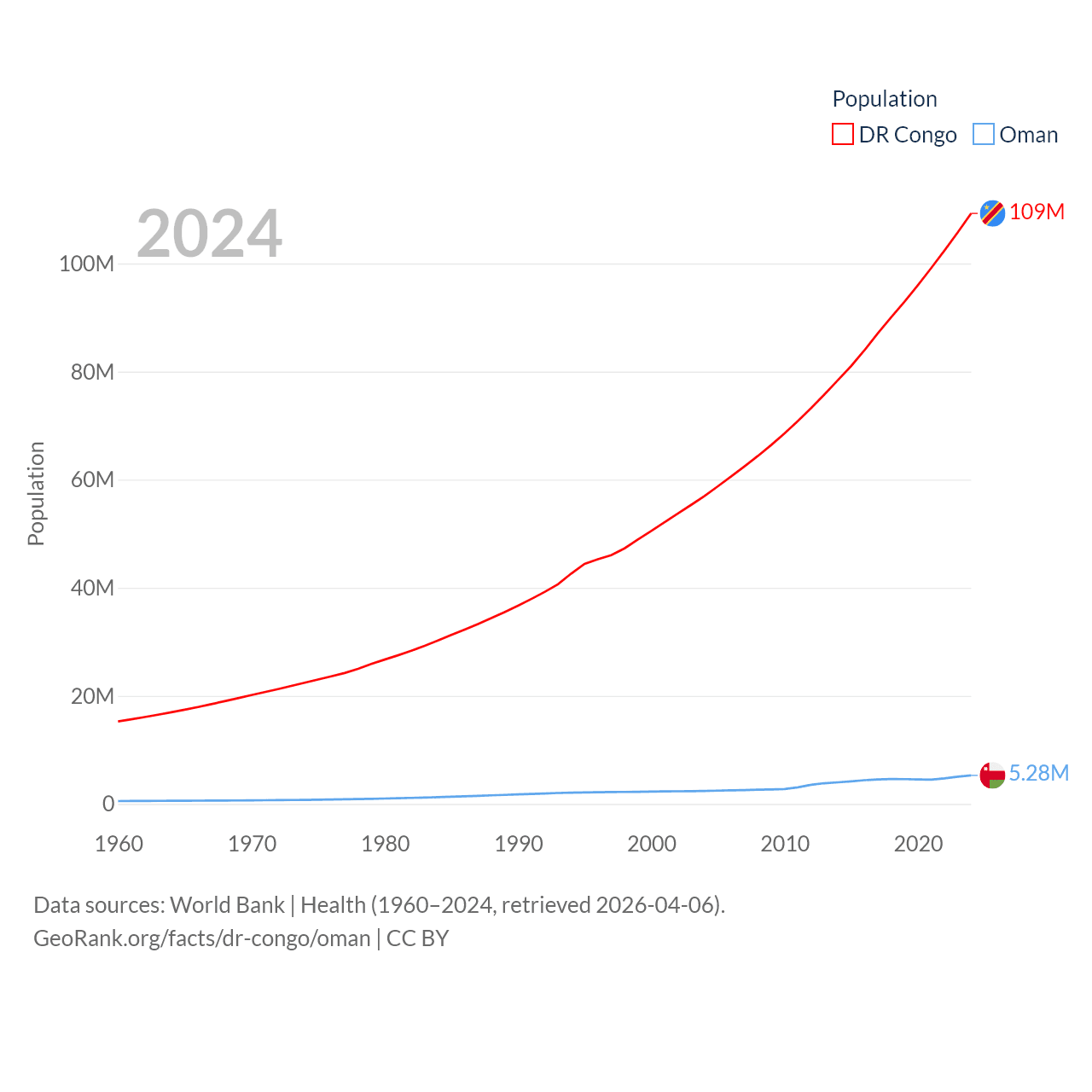 The DR Congo has a population of 109M (ranked 15/197), compared with 5.28M in Oman (ranked 124/197). The DR Congo's land area is 875,313 sq mi versus 119,499 sq mi for Oman (ranked 11th vs. 68th).