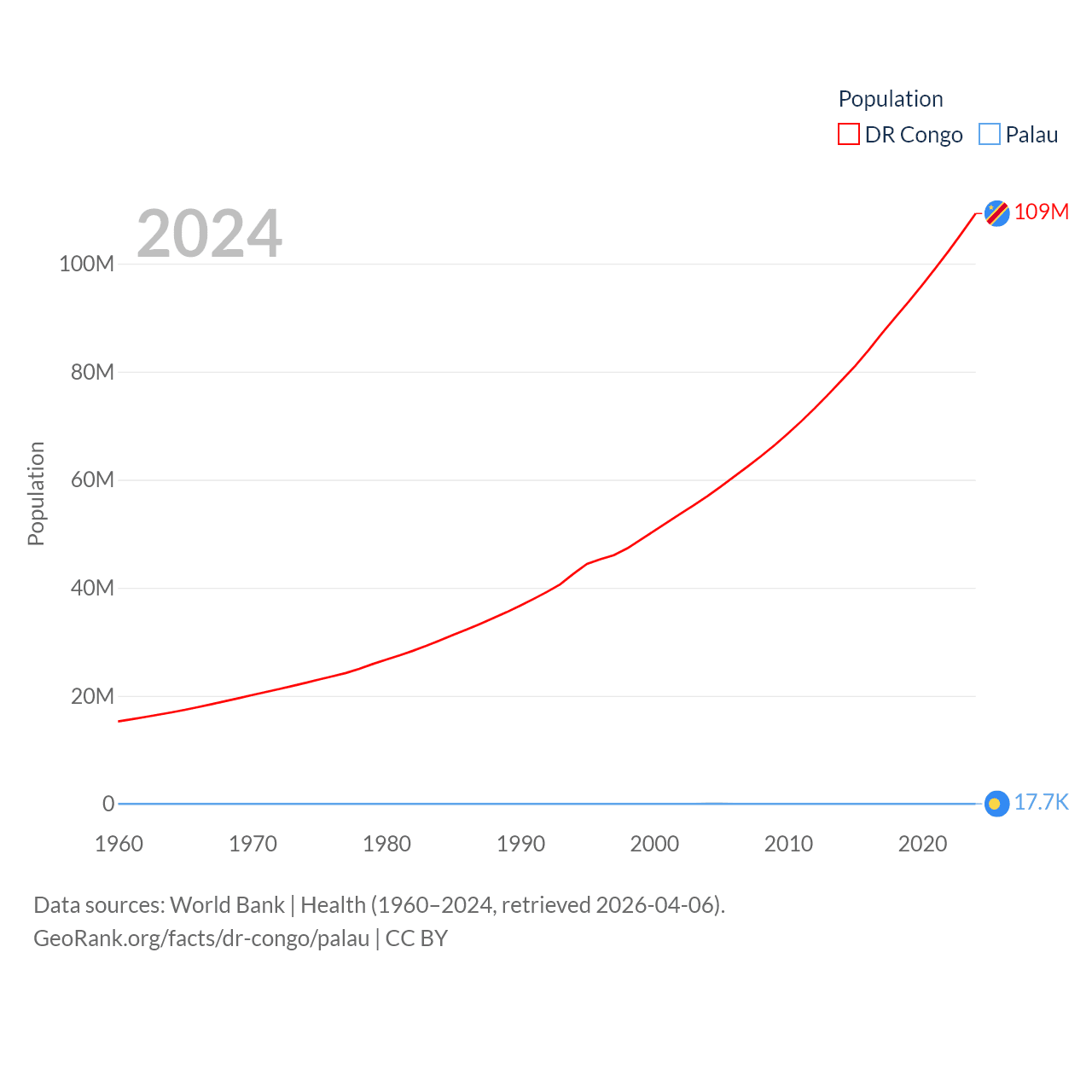 The DR Congo has a population of 109M (ranked 15/197), compared with 17.7K in Palau (ranked 194/197). The DR Congo's land area is 875,313 sq mi versus 177.6 sq mi for Palau (ranked 11th vs. 180th).