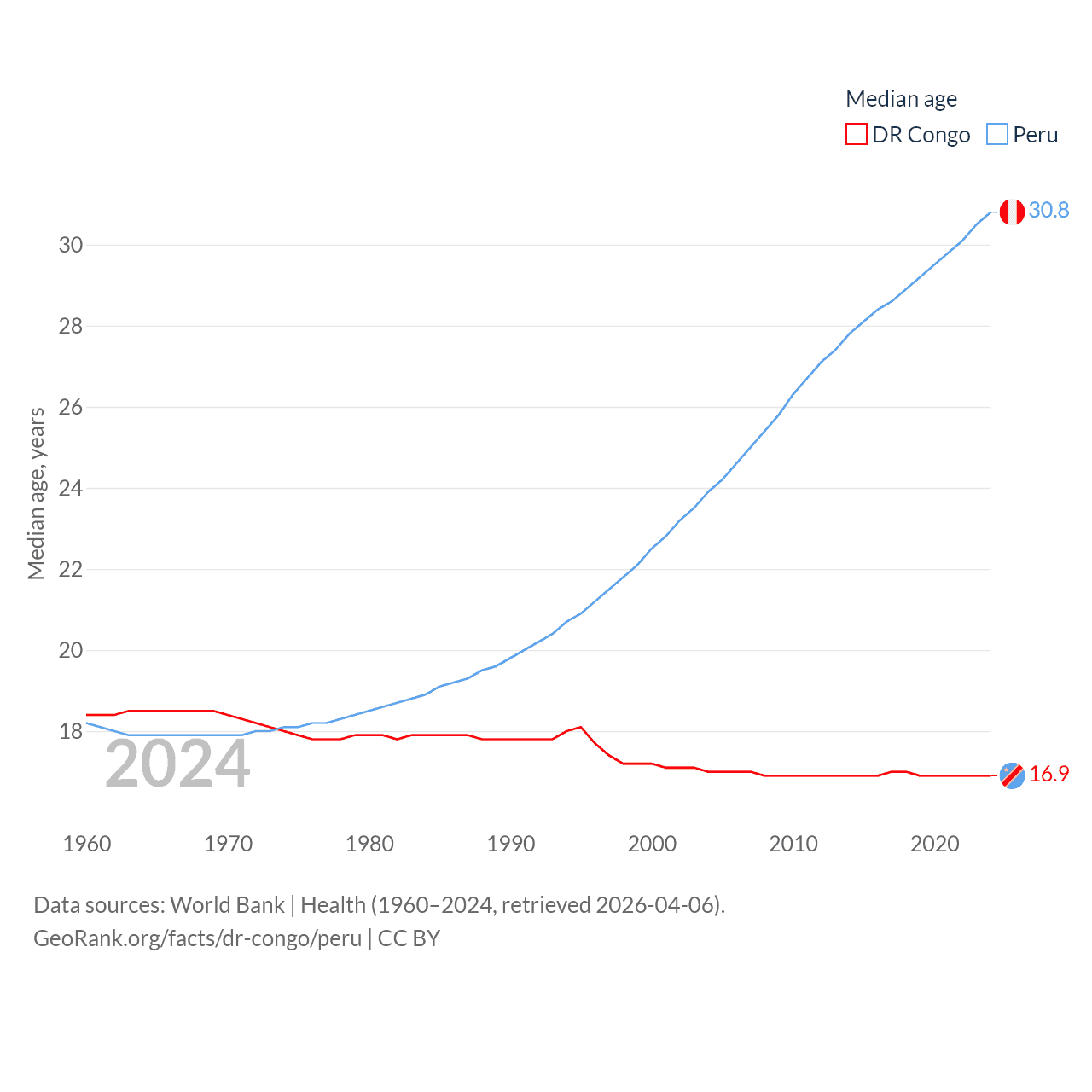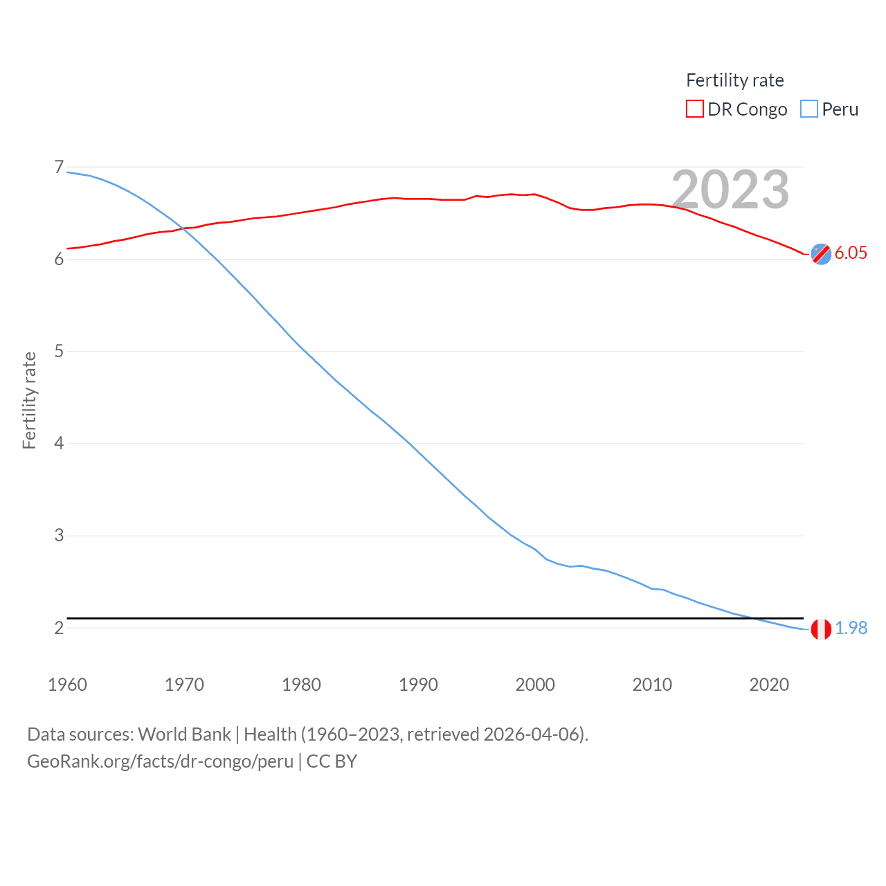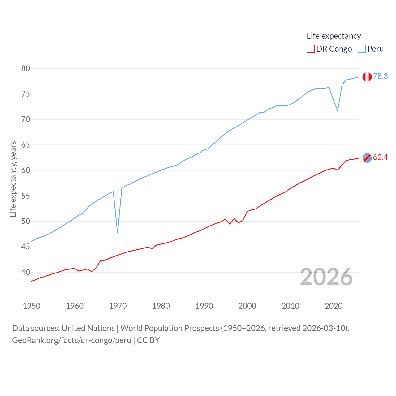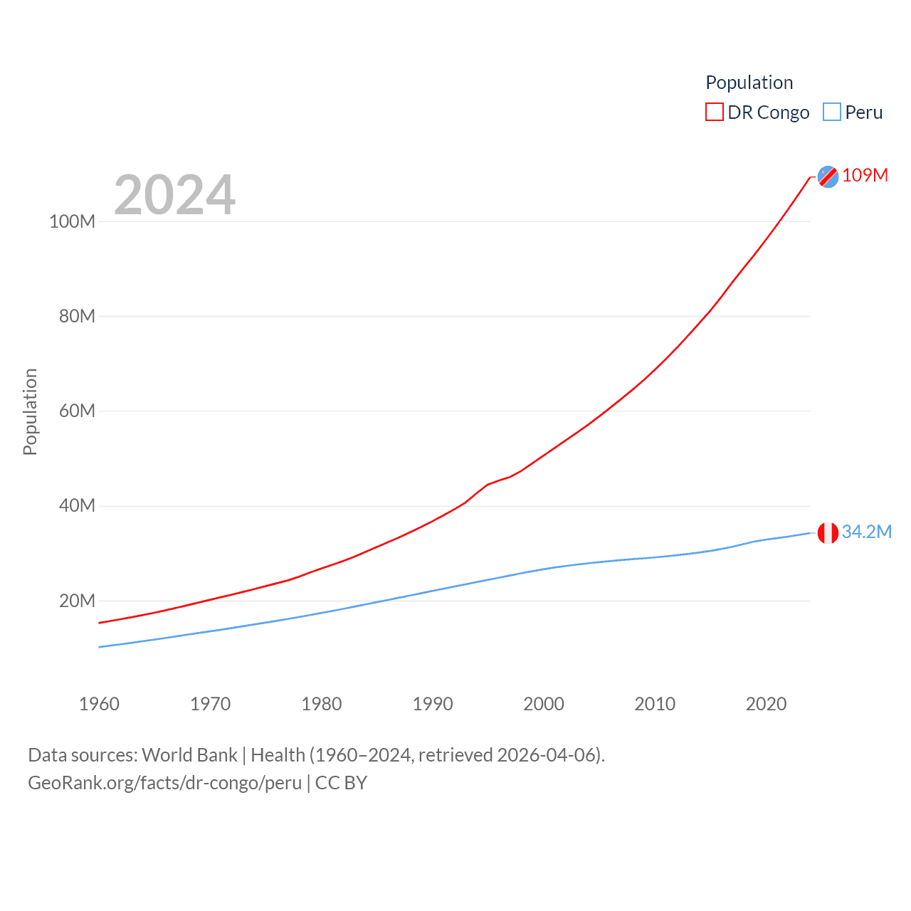 The DR Congo has a population of 109M (ranked 15/197), compared with 34.2M in Peru (ranked 48/197). The DR Congo's land area is 875,313 sq mi versus 494,211 sq mi for Peru (ranked 11th vs. 19th).