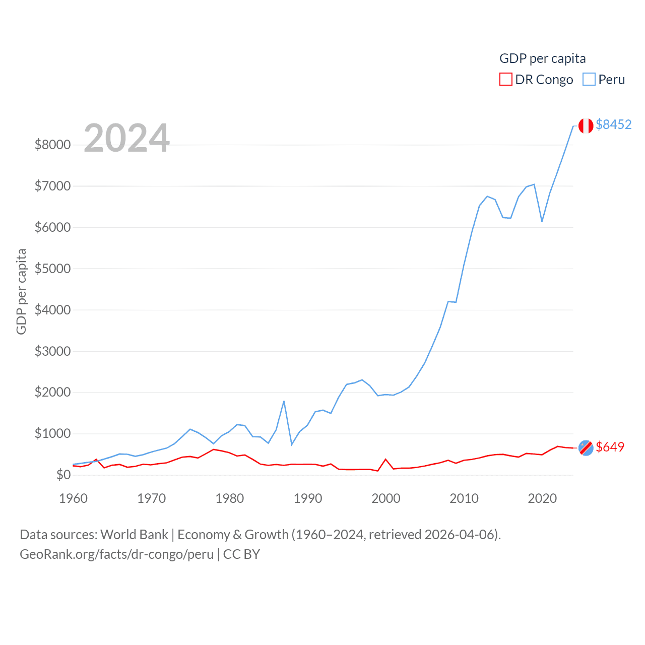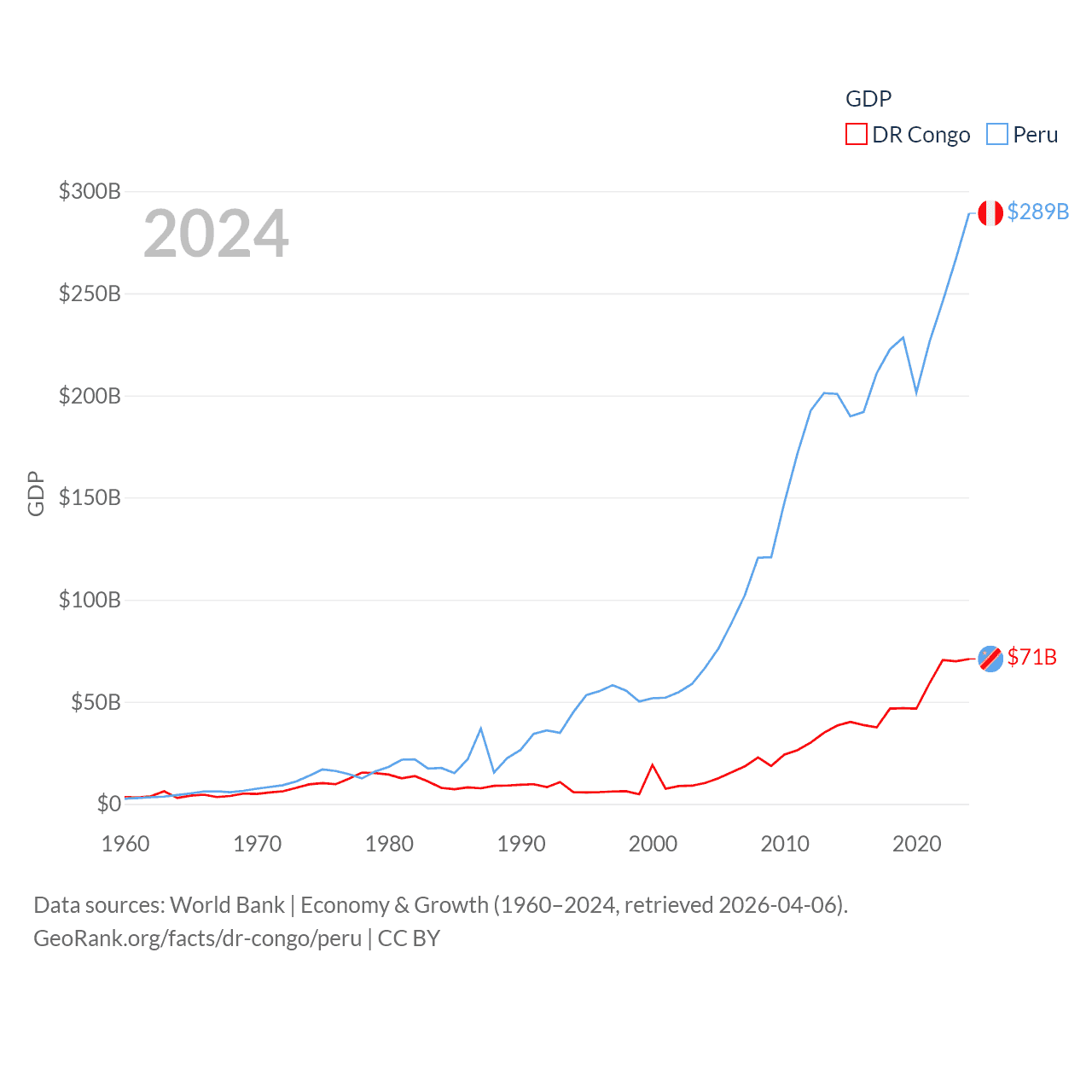 By GDP, The DR Congo ranks 87/197 ($71B) and Peru ranks 49/197 ($289B). By GDP per capita, The DR Congo ranks 190/197 ($649), while Peru ranks 91/197 ($8,452).