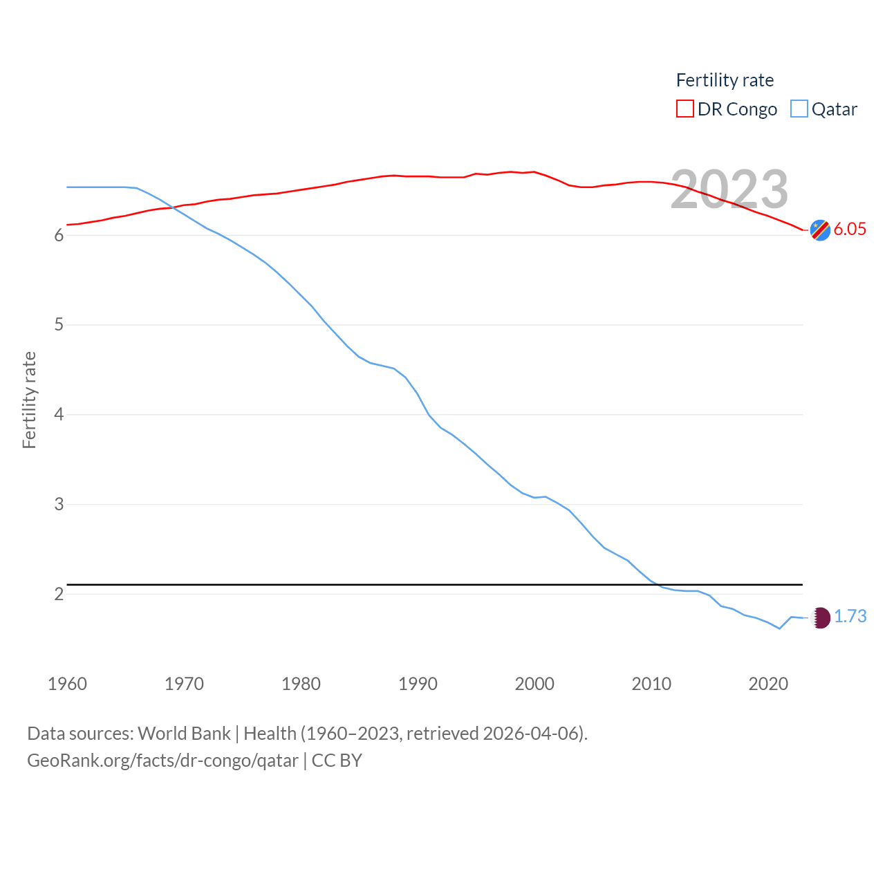 The DR Congo has a population of 109M (ranked 15/197), compared with 2.86M in Qatar (ranked 138/197). The DR Congo's land area is 875,313 sq mi versus 4,436 sq mi for Qatar (ranked 11th vs. 158th).