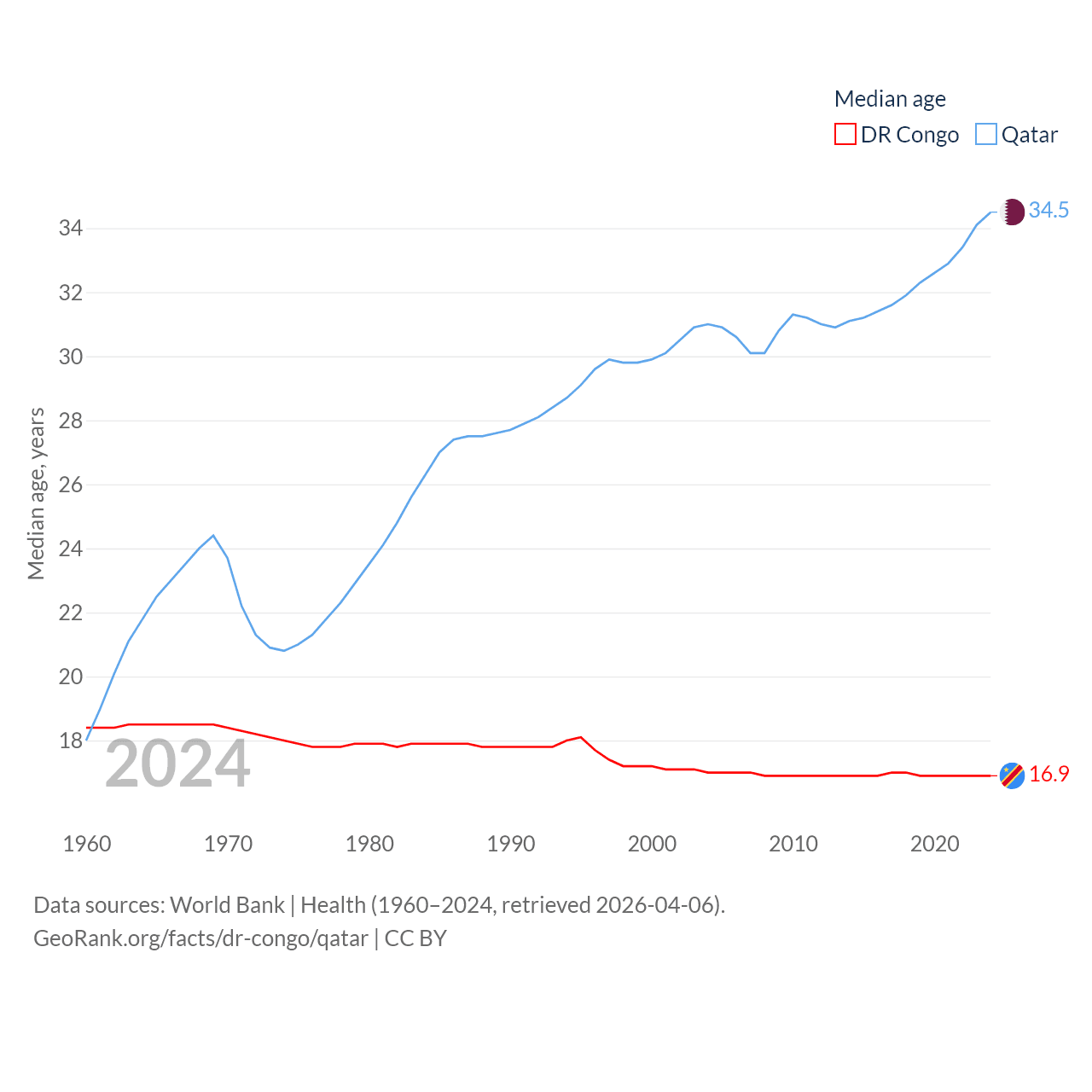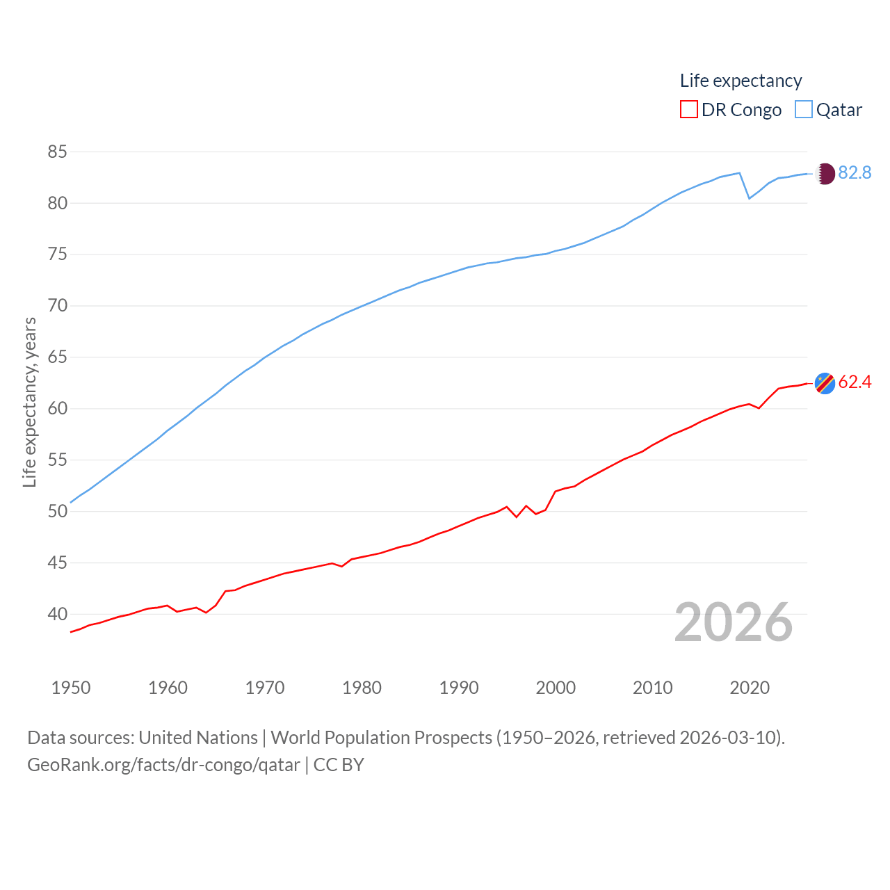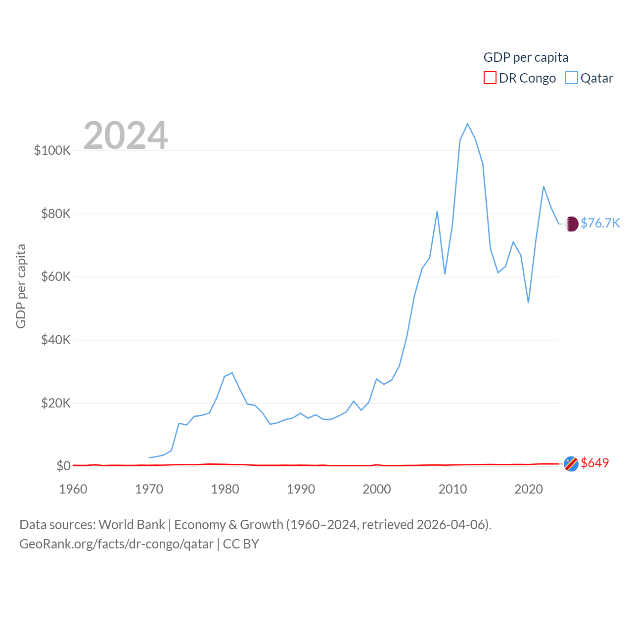 By GDP, The DR Congo ranks 87/197 ($71B) and Qatar ranks 56/197 ($219B). By GDP per capita, The DR Congo ranks 190/197 ($649), while Qatar ranks 11/197 ($76,689).