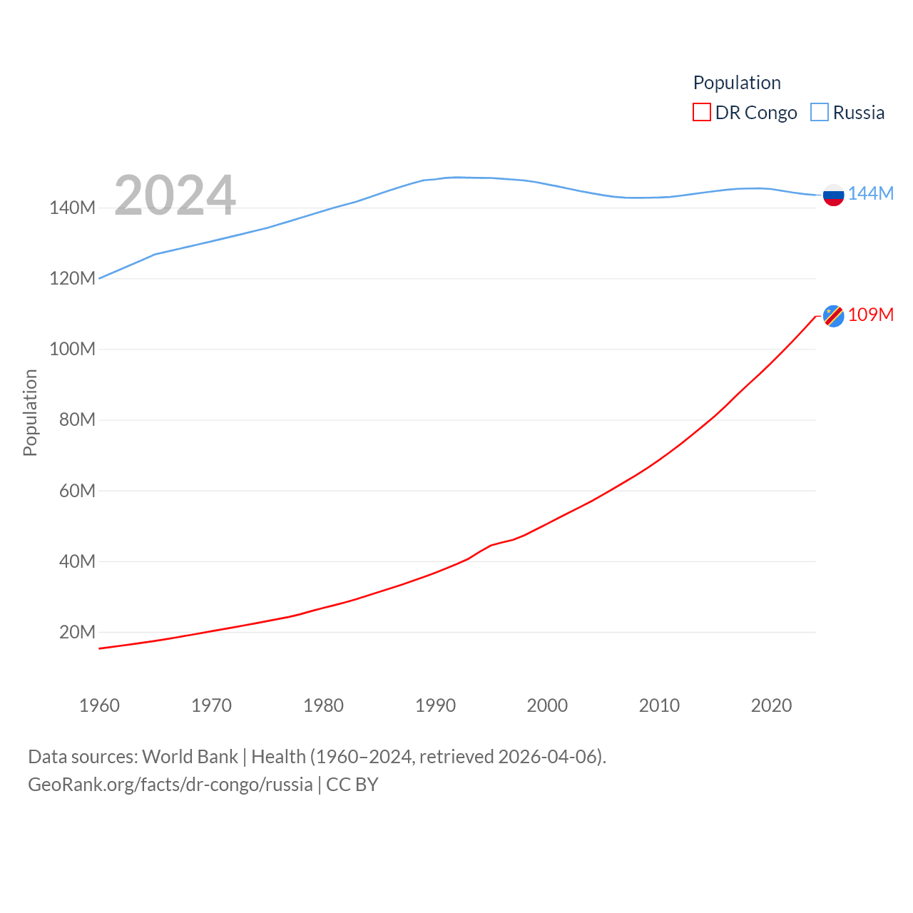 The DR Congo has a population of 109M (ranked 15/197), compared with 144M in Russia (ranked 9/197). The DR Congo's land area is 875,313 sq mi versus 6,323,145 sq mi for Russia (ranked 11th vs. 1st).