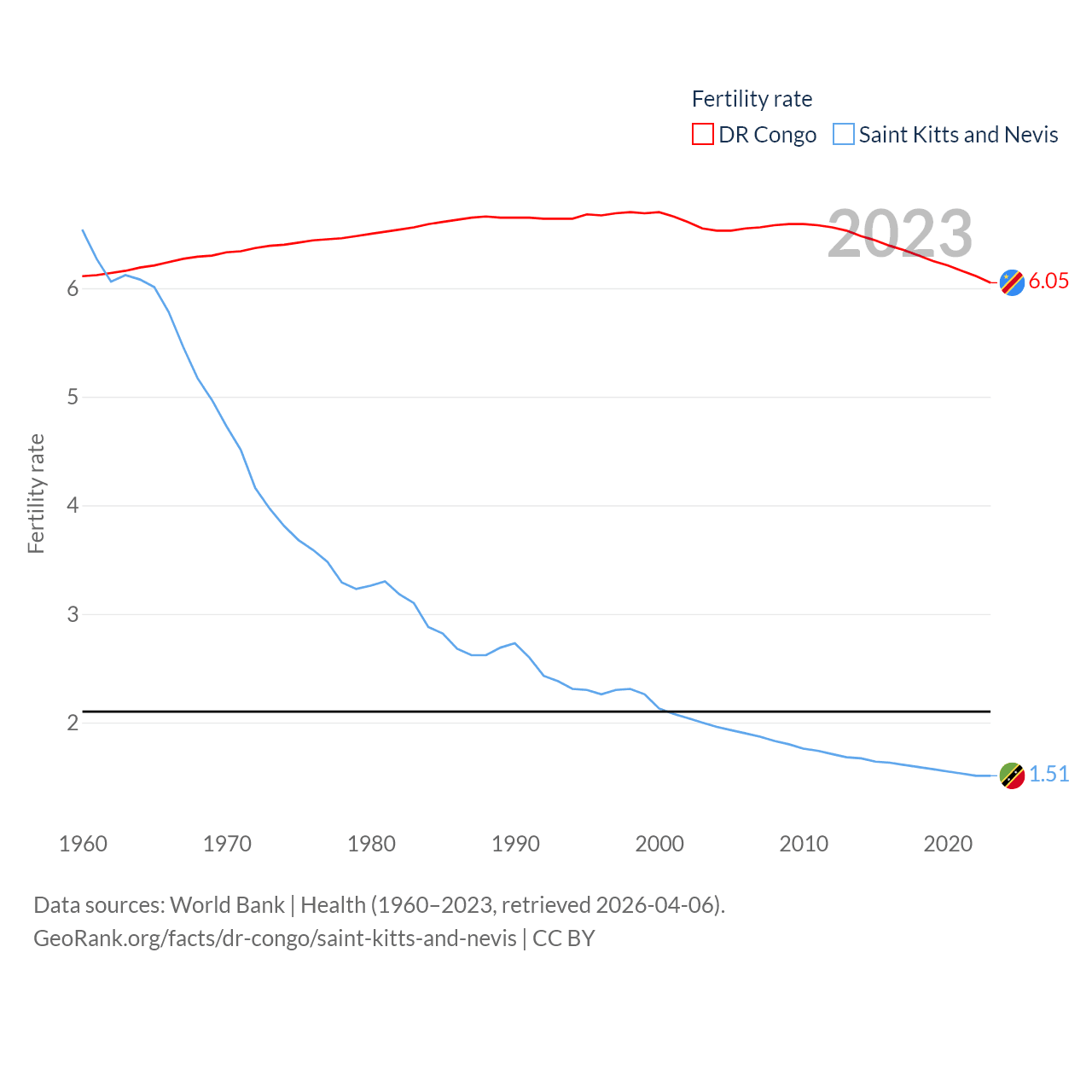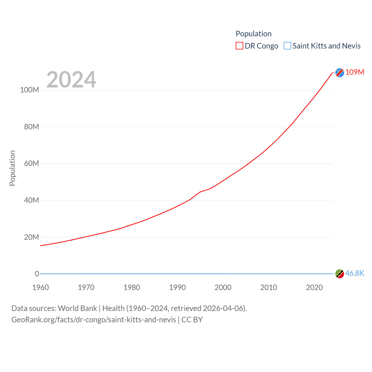 The DR Congo has a population of 109M (ranked 15/197), compared with 46.8K in Saint Kitts and Nevis (ranked 189/197). The DR Congo's land area is 875,313 sq mi versus 100.4 sq mi for Saint Kitts and Nevis (ranked 11th vs. 189th).