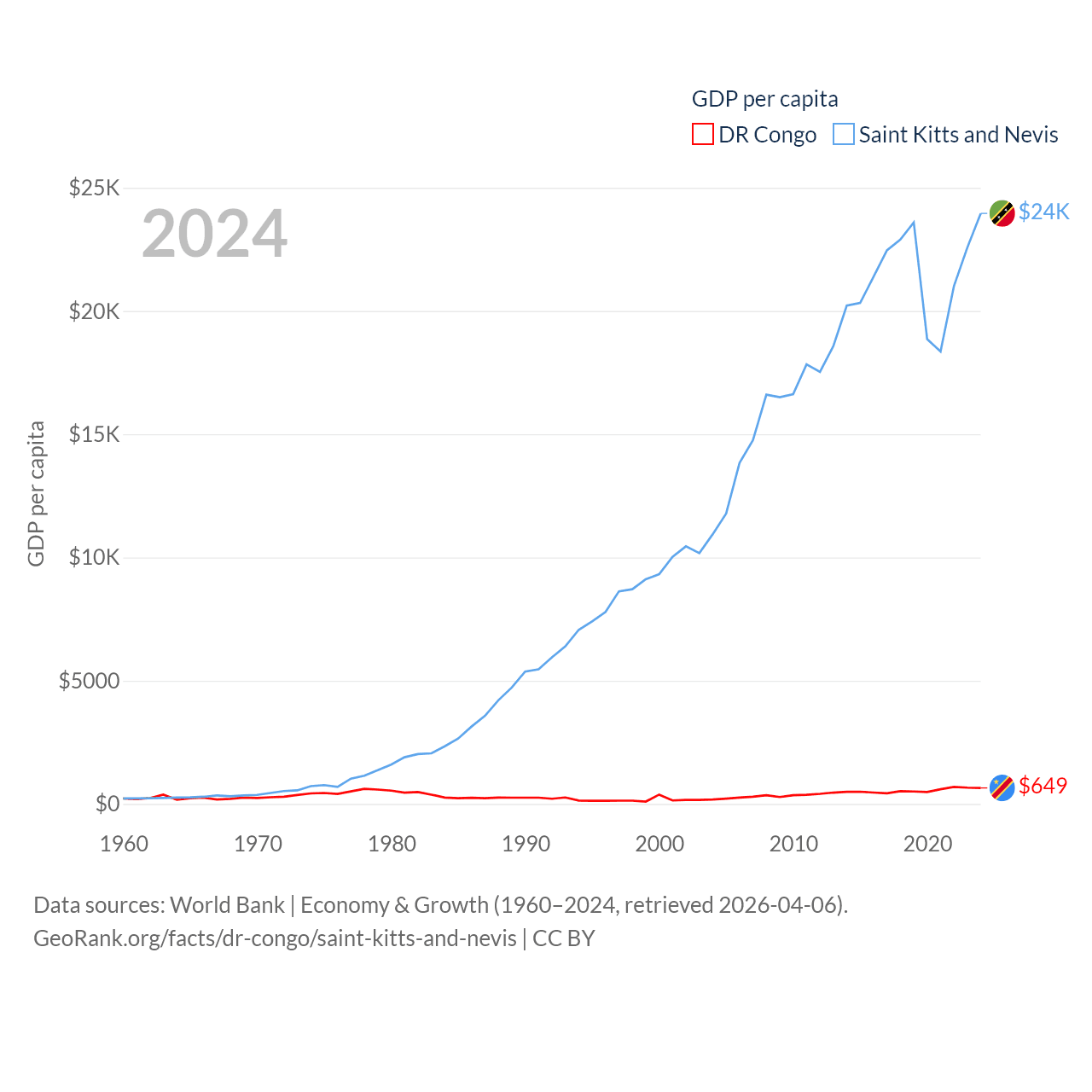 By GDP, The DR Congo ranks 87/197 ($71B) and Saint Kitts and Nevis ranks 187/197 ($1.12B). By GDP per capita, The DR Congo ranks 190/197 ($649), while Saint Kitts and Nevis ranks 51/197 ($23,961).