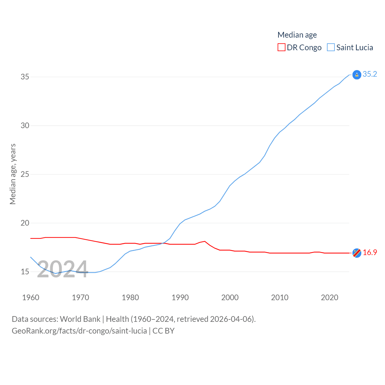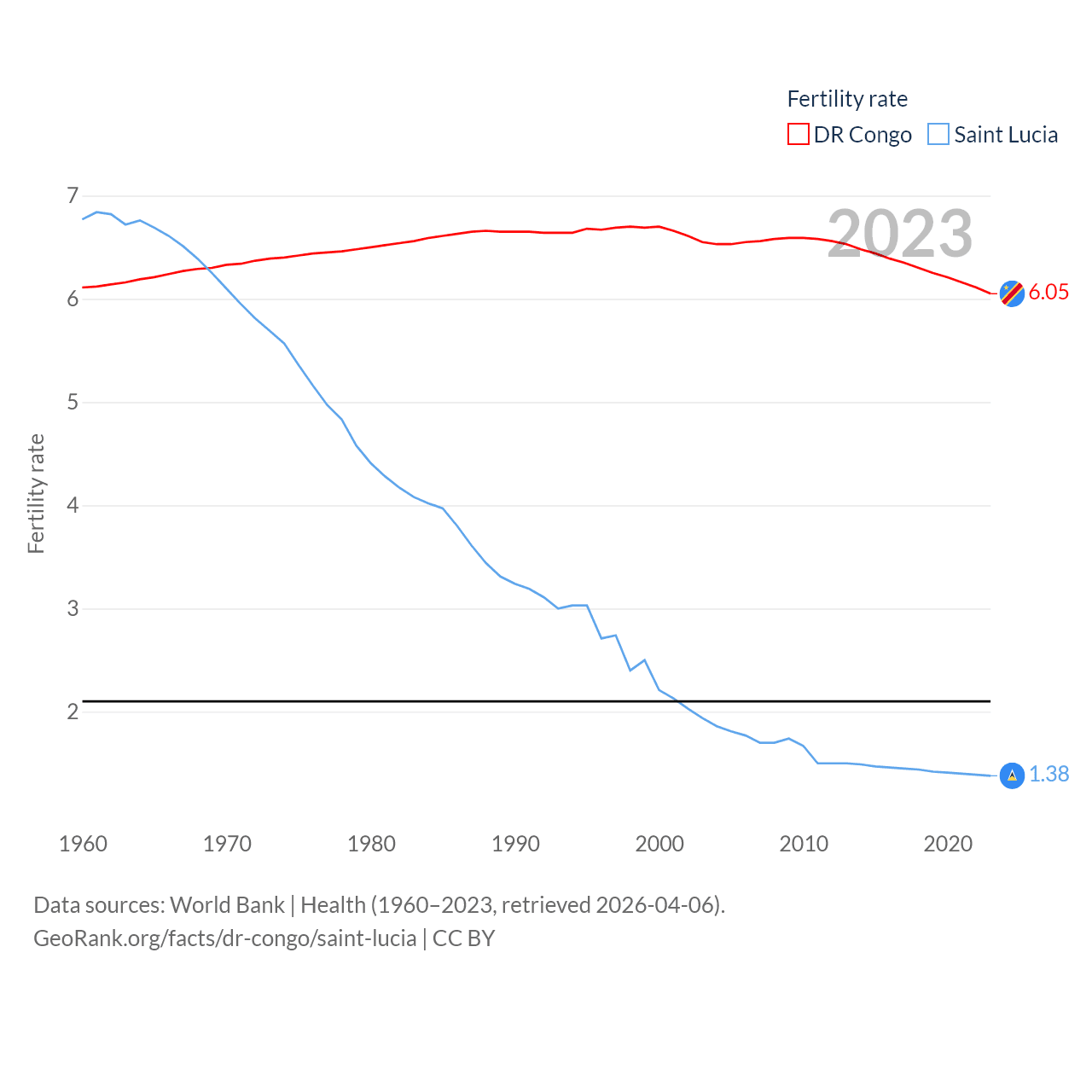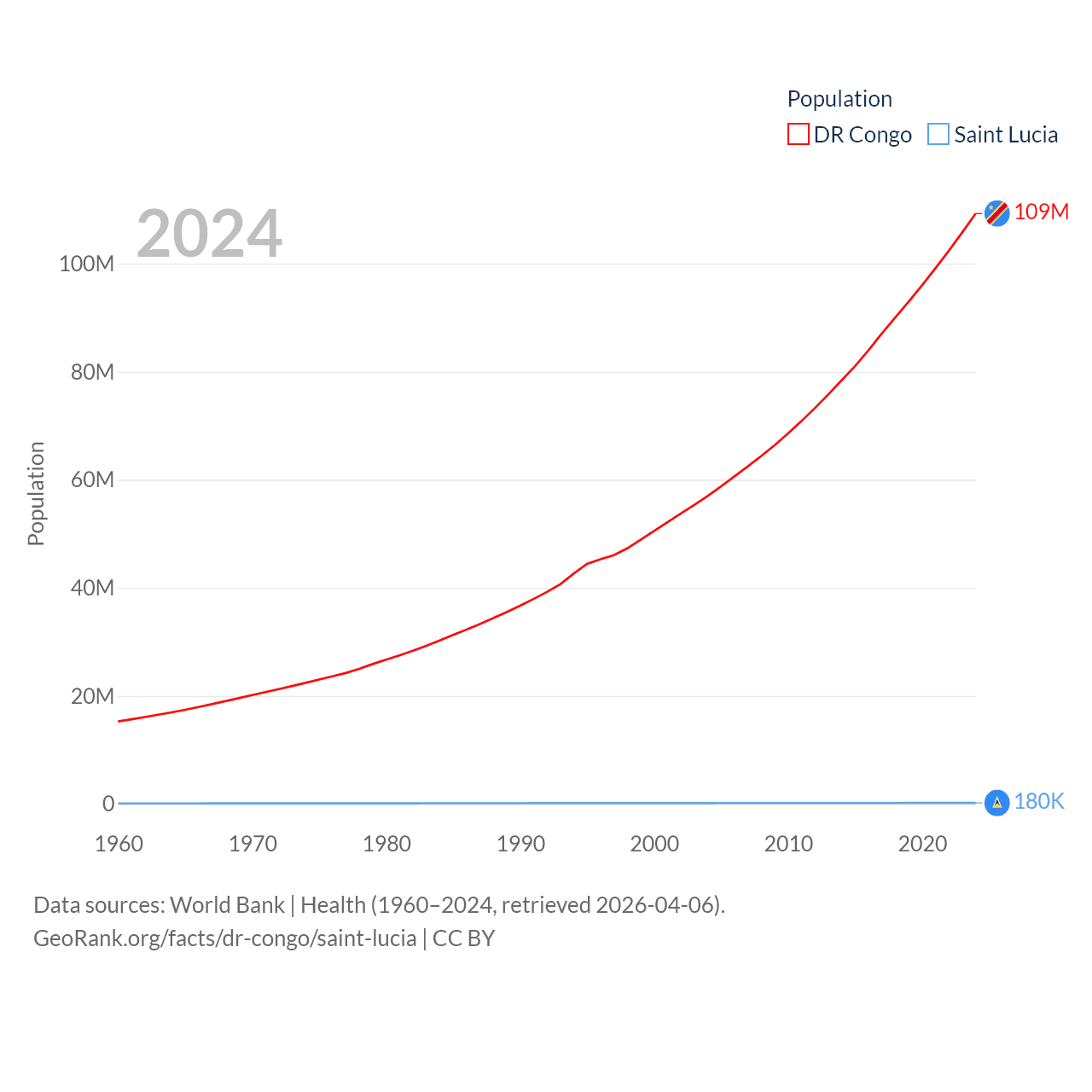 The DR Congo has a population of 109M (ranked 15/197), compared with 180K in Saint Lucia (ranked 178/197). The DR Congo's land area is 875,313 sq mi versus 235.5 sq mi for Saint Lucia (ranked 11th vs. 178th).