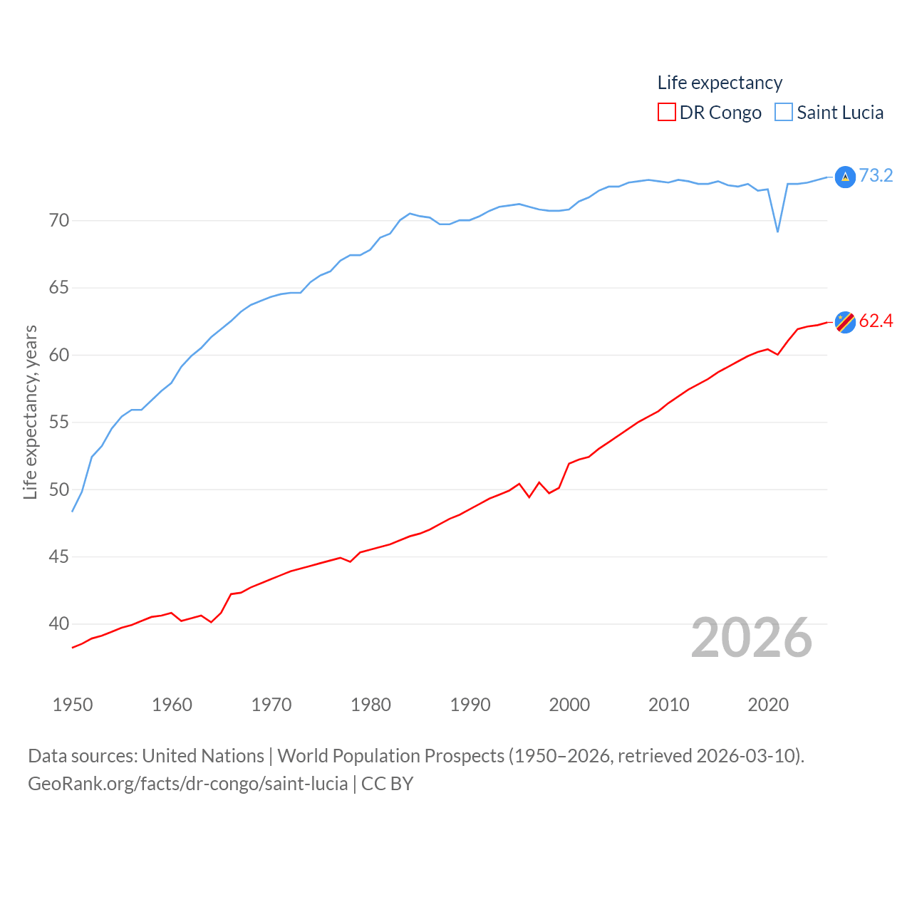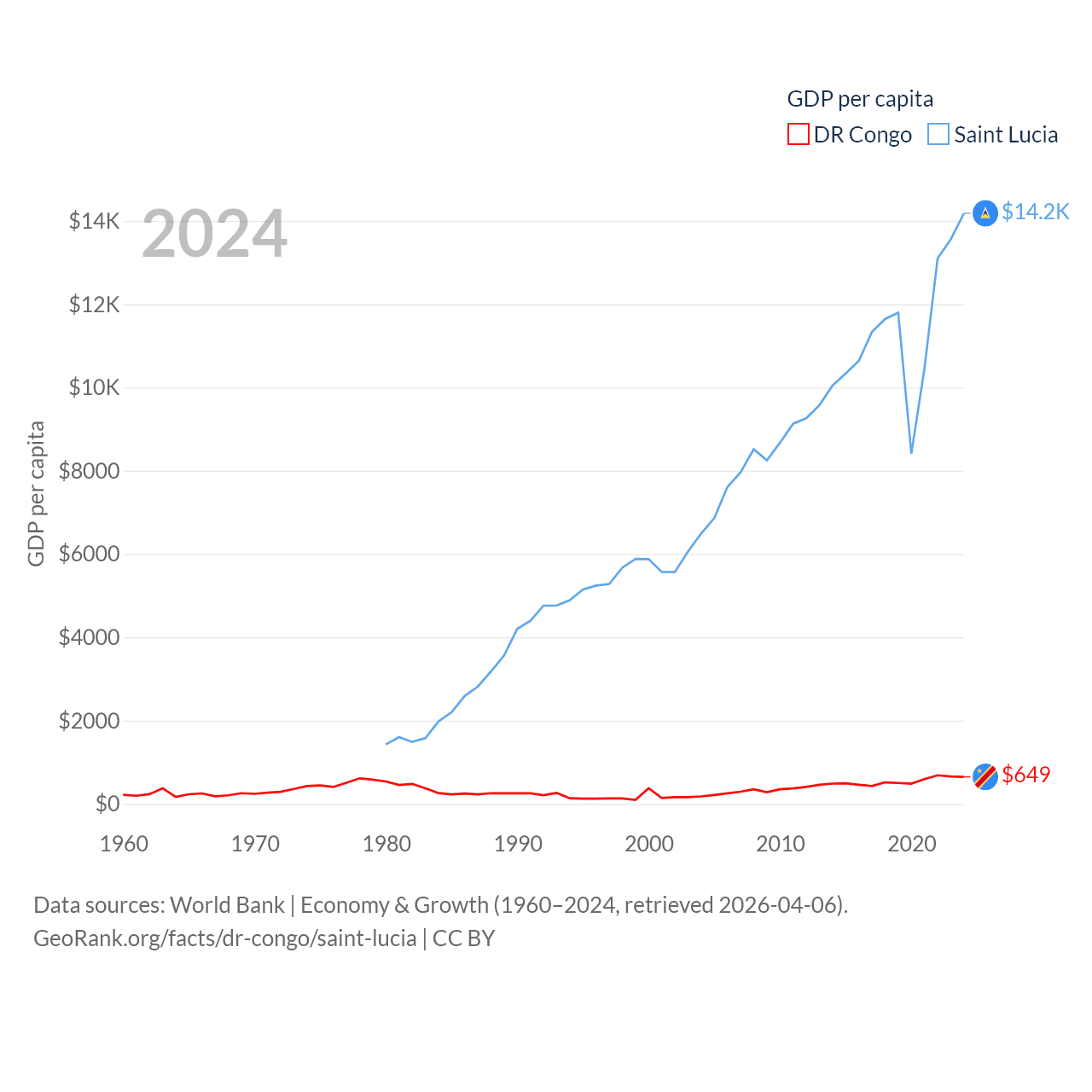 By GDP, The DR Congo ranks 87/197 ($71B) and Saint Lucia ranks 173/197 ($2.55B). By GDP per capita, The DR Congo ranks 190/197 ($649), while Saint Lucia ranks 70/197 ($14,182).