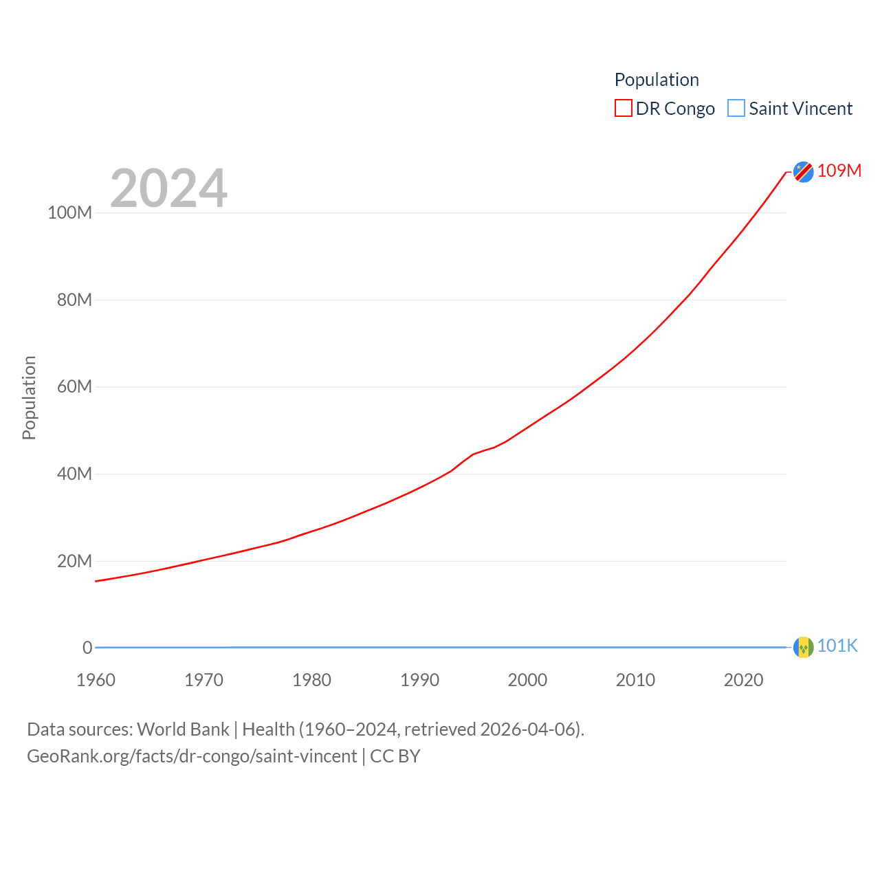 The DR Congo has a population of 109M (ranked 15/197), compared with 101K in Saint Vincent (ranked 184/197). The DR Congo's land area is 875,313 sq mi versus 150.6 sq mi for Saint Vincent (ranked 11th vs. 185th).