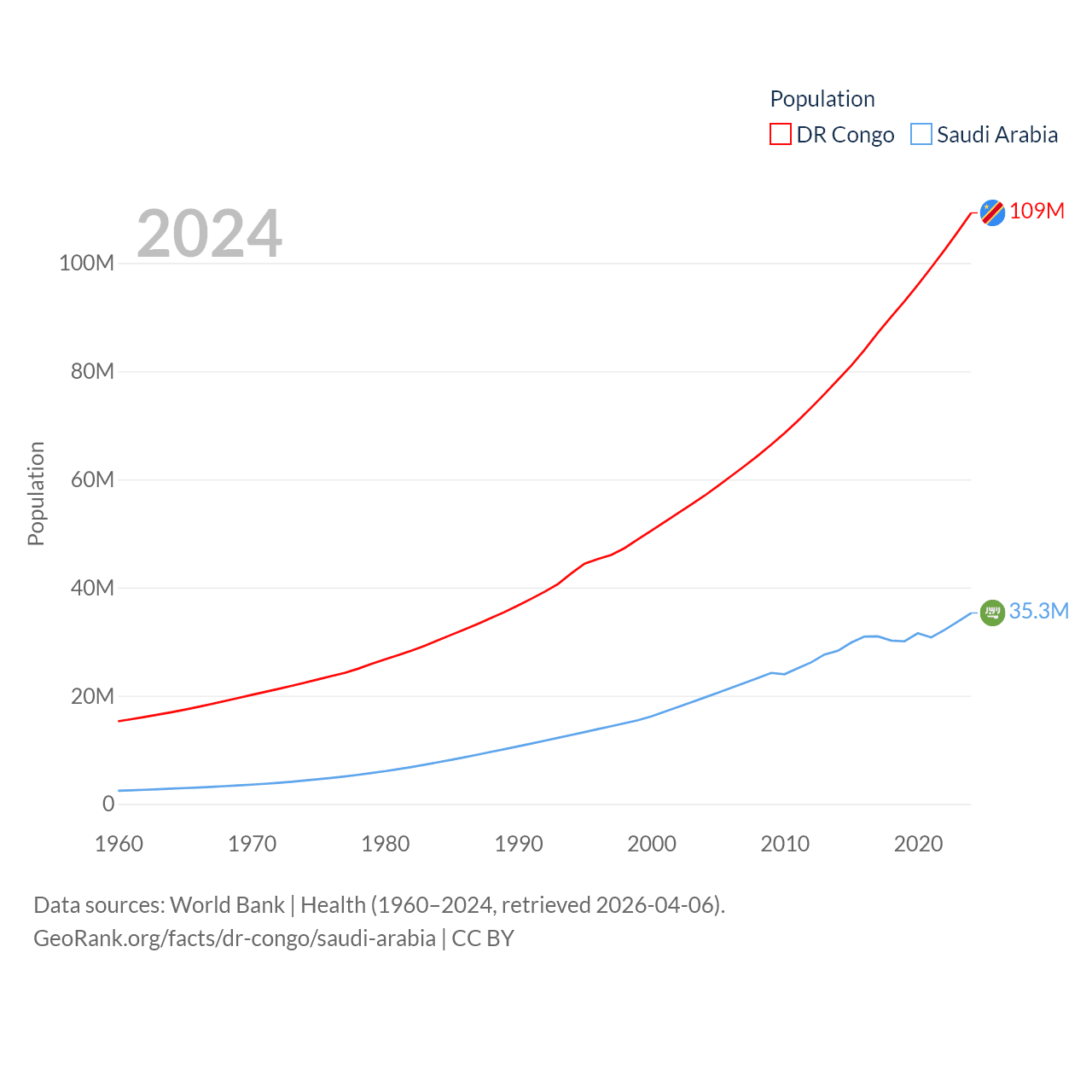 The DR Congo has a population of 109M (ranked 15/197), compared with 35.3M in Saudi Arabia (ranked 45/197). The DR Congo's land area is 875,313 sq mi versus 830,000 sq mi for Saudi Arabia (ranked 11th vs. 12th).