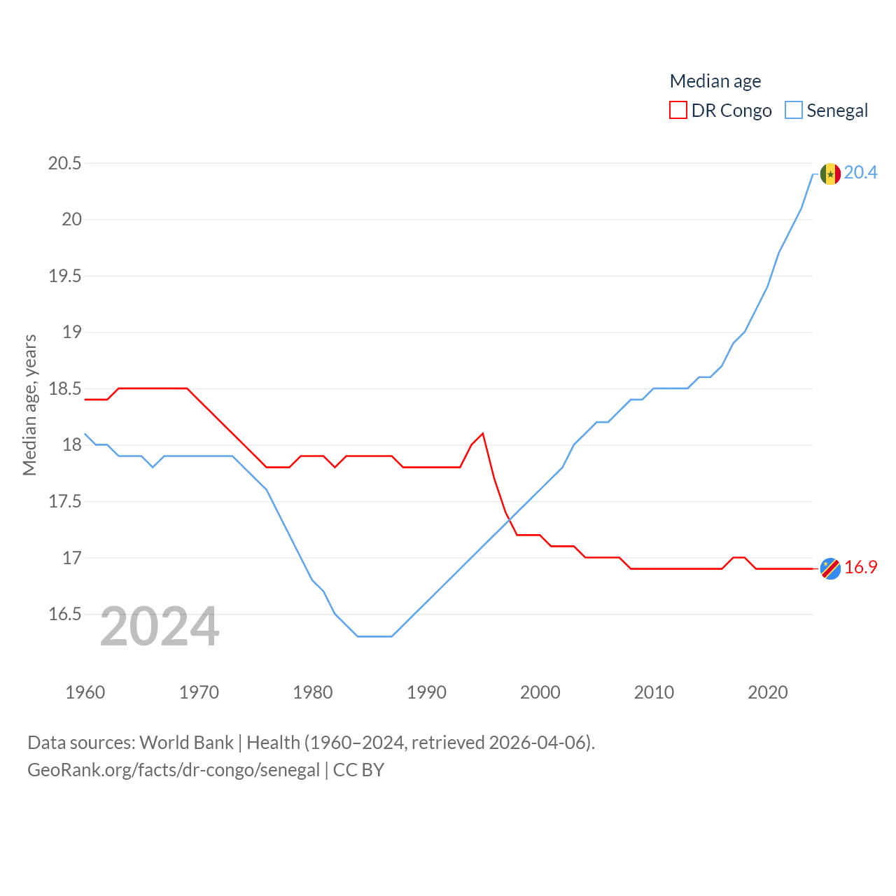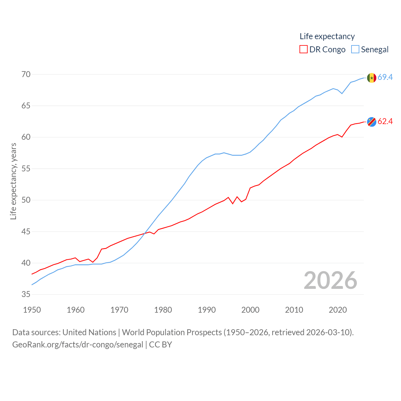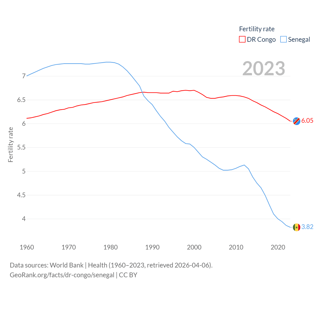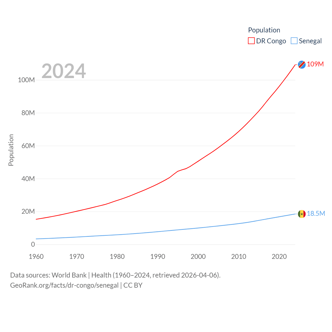 The DR Congo has a population of 109M (ranked 15/197), compared with 18.5M in Senegal (ranked 69/197). The DR Congo's land area is 875,313 sq mi versus 74,336 sq mi for Senegal (ranked 11th vs. 85th).