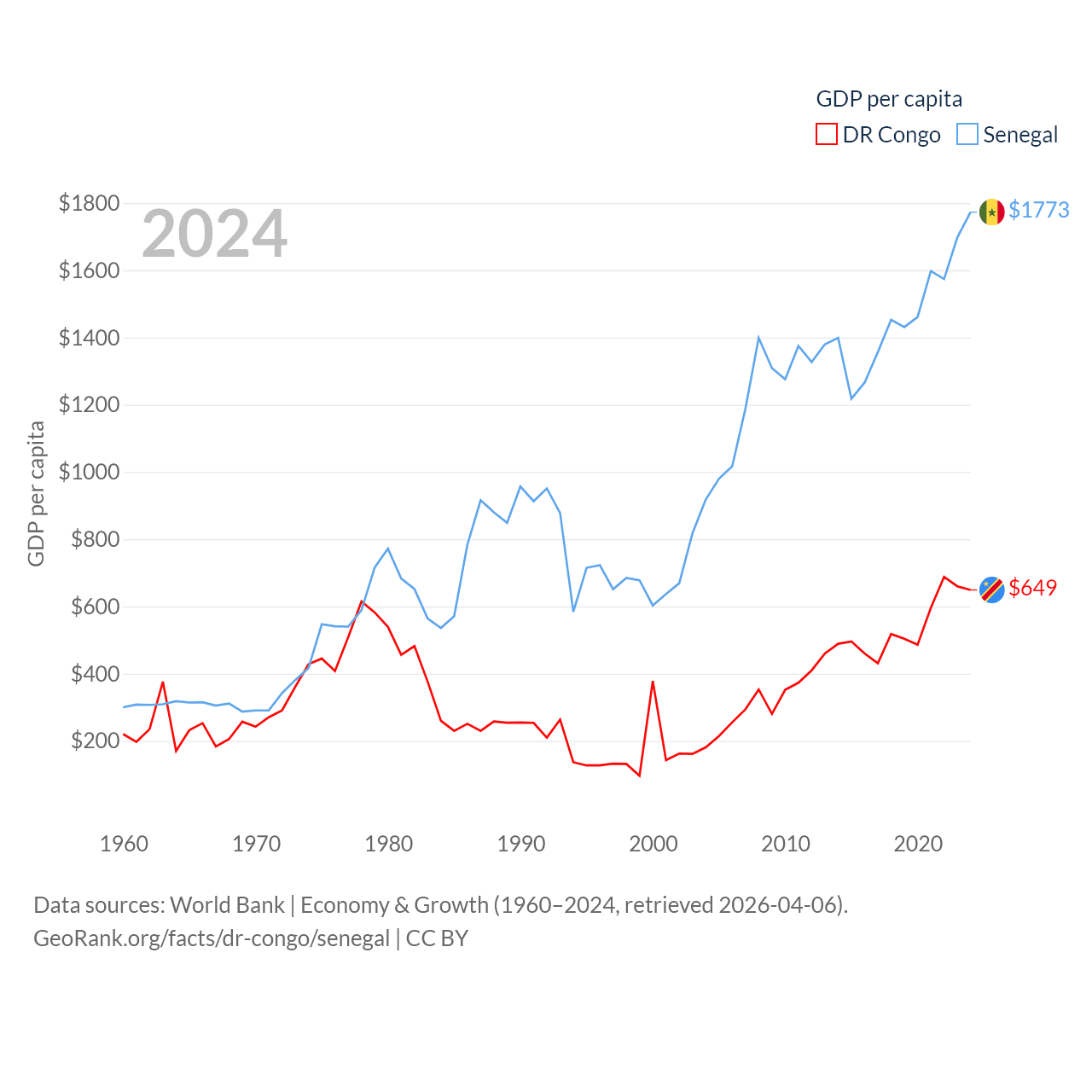 By GDP, The DR Congo ranks 87/197 ($71B) and Senegal ranks 109/197 ($32.8B). By GDP per capita, The DR Congo ranks 190/197 ($649), while Senegal ranks 159/197 ($1,773).