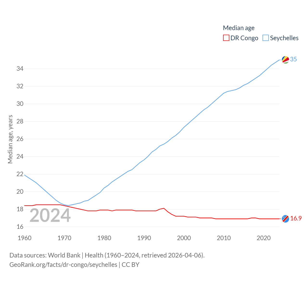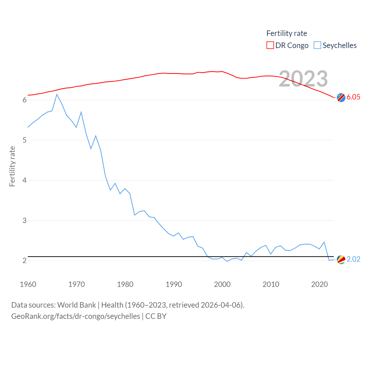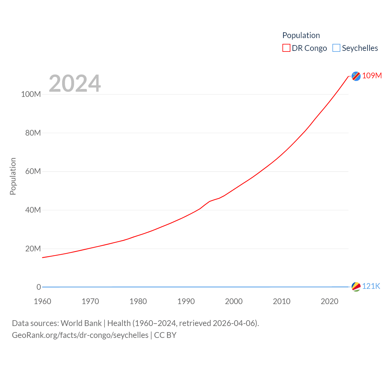 The DR Congo has a population of 109M (ranked 15/197), compared with 121K in The Seychelles (ranked 181/197). The DR Congo's land area is 875,313 sq mi versus 177.6 sq mi for The Seychelles (ranked 11th vs. 181st).