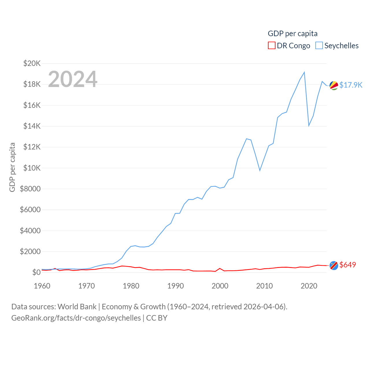 By GDP, The DR Congo ranks 87/197 ($71B) and The Seychelles ranks 178/197 ($2.17B). By GDP per capita, The DR Congo ranks 190/197 ($649), while The Seychelles ranks 63/197 ($17,859).
