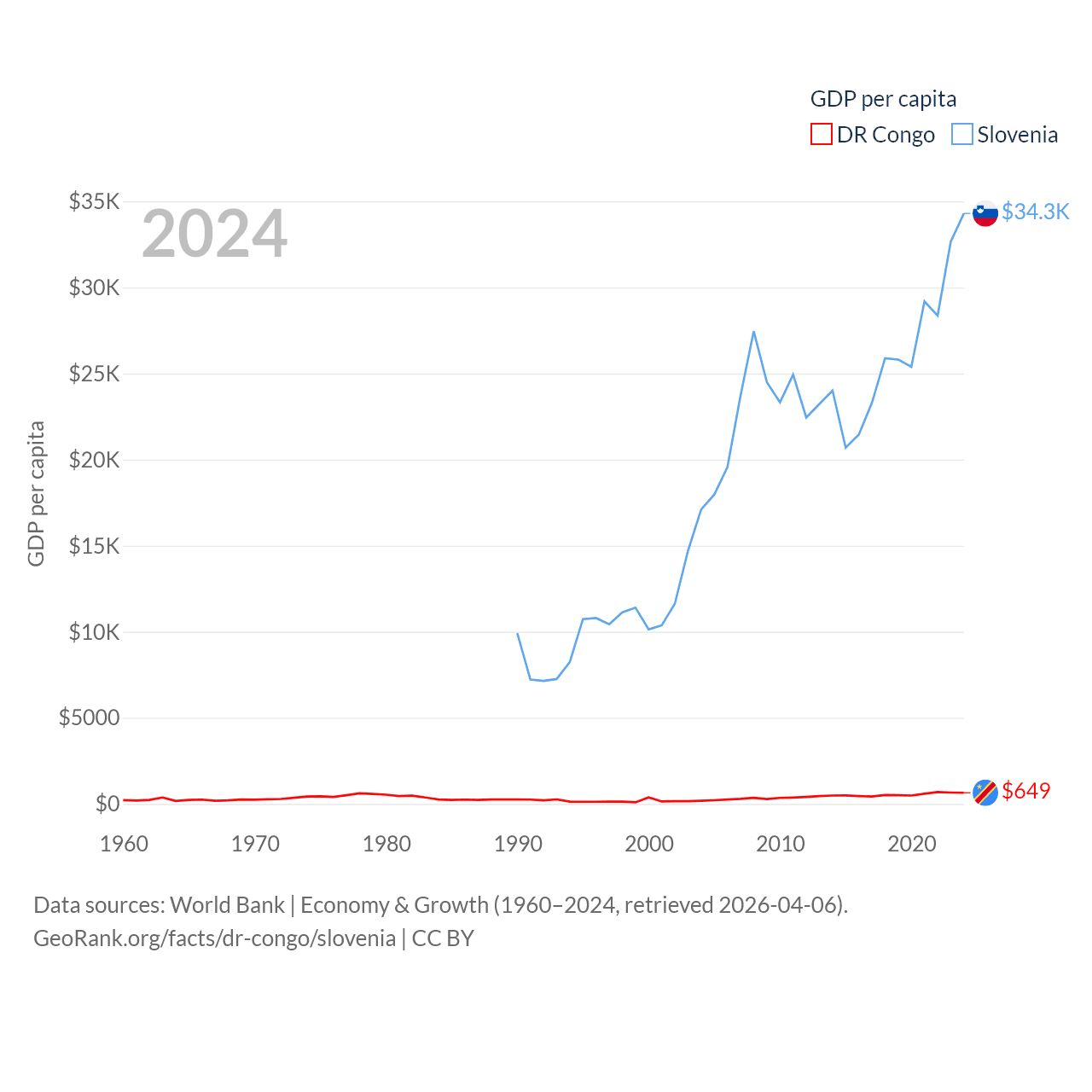By GDP, The DR Congo ranks 87/197 ($71B) and Slovenia ranks 86/197 ($73B). By GDP per capita, The DR Congo ranks 190/197 ($649), while Slovenia ranks 34/197 ($34,301).