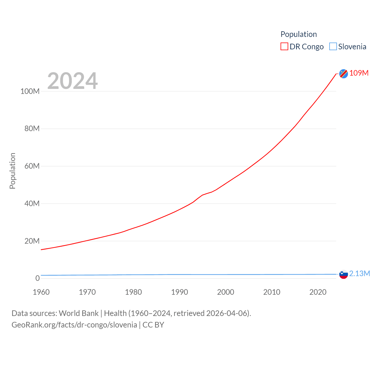 The DR Congo has a population of 109M (ranked 15/197), compared with 2.13M in Slovenia (ranked 147/197). The DR Congo's land area is 875,313 sq mi versus 7,774 sq mi for Slovenia (ranked 11th vs. 151st).