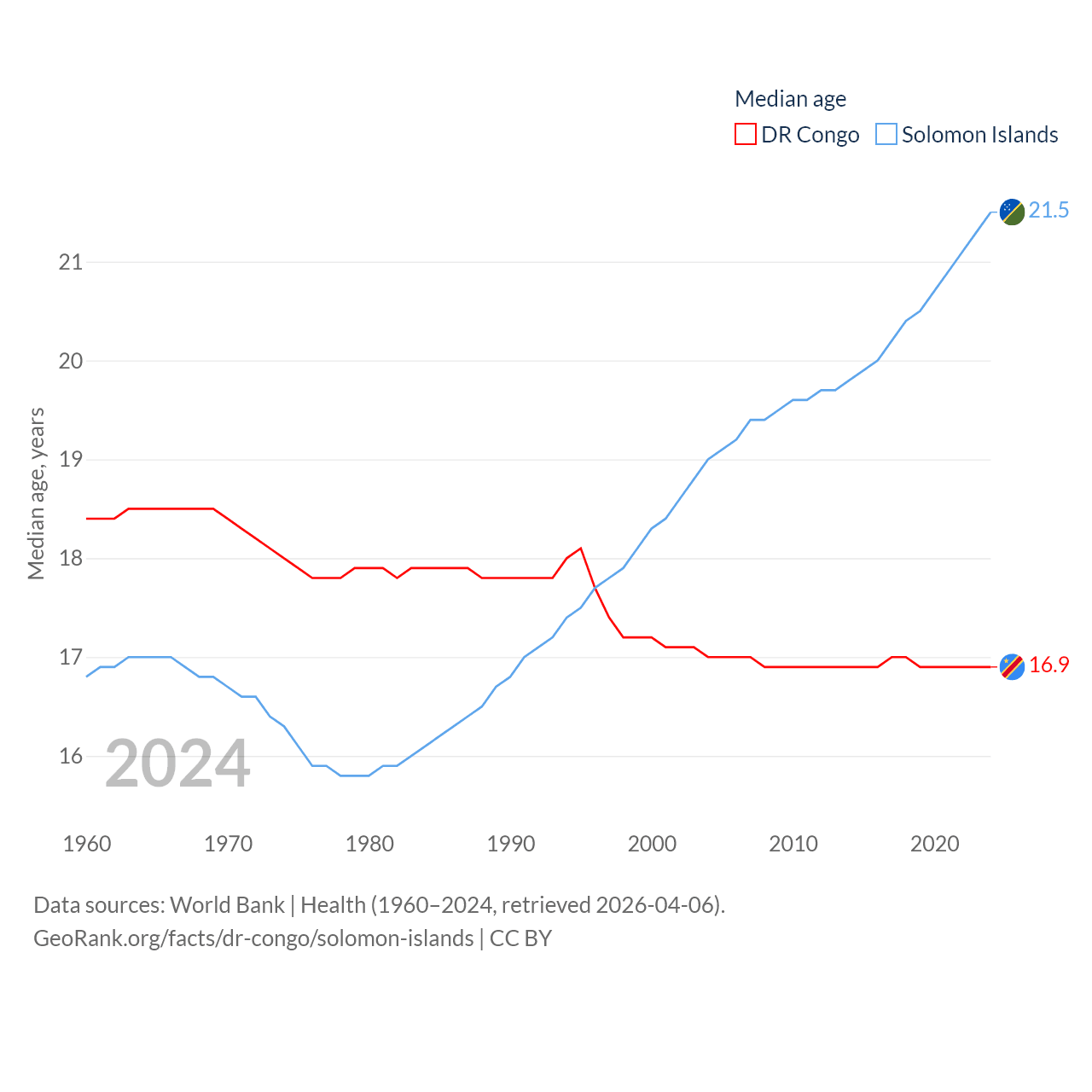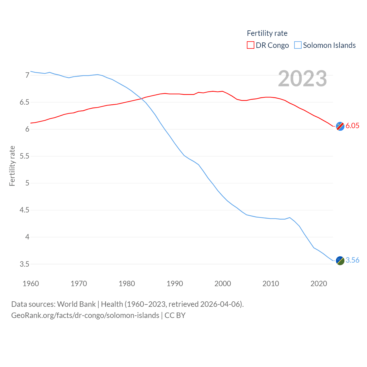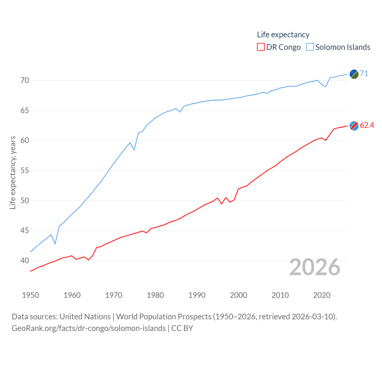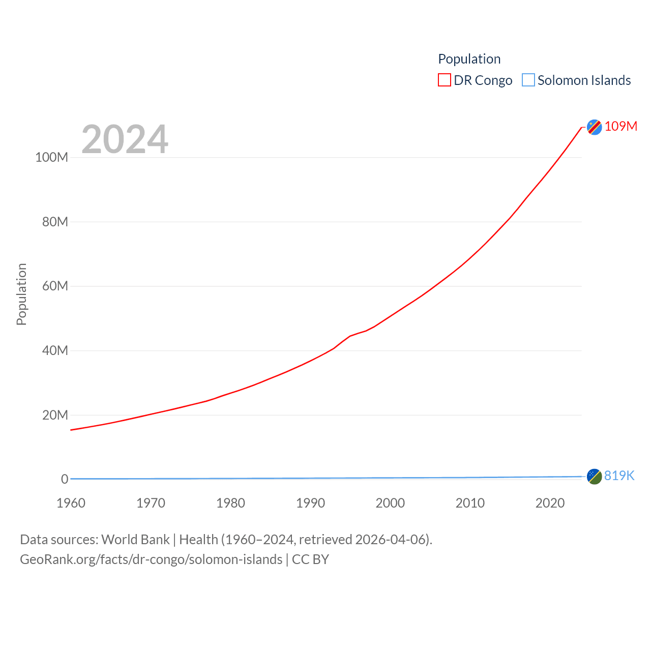 The DR Congo has a population of 109M (ranked 15/197), compared with 819K in The Solomon Islands (ranked 162/197). The DR Congo's land area is 875,313 sq mi versus 10,807 sq mi for The Solomon Islands (ranked 11th vs. 141st).