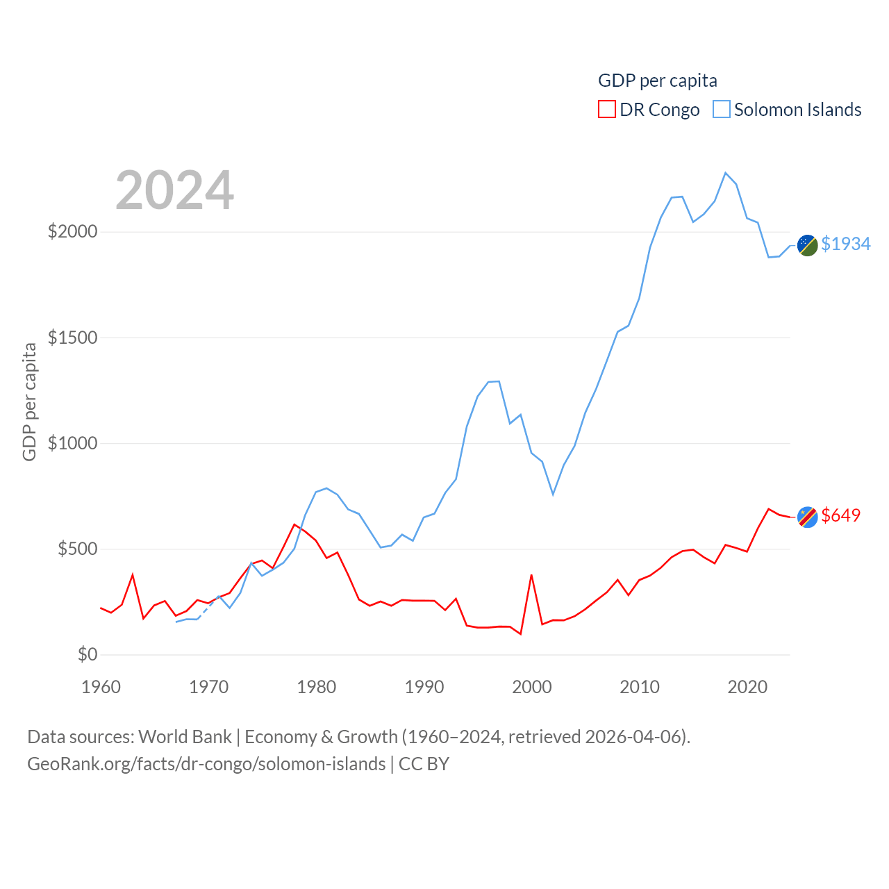 By GDP, The DR Congo ranks 87/197 ($71B) and The Solomon Islands ranks 182/197 ($1.58B). By GDP per capita, The DR Congo ranks 190/197 ($649), while The Solomon Islands ranks 157/197 ($1,934).