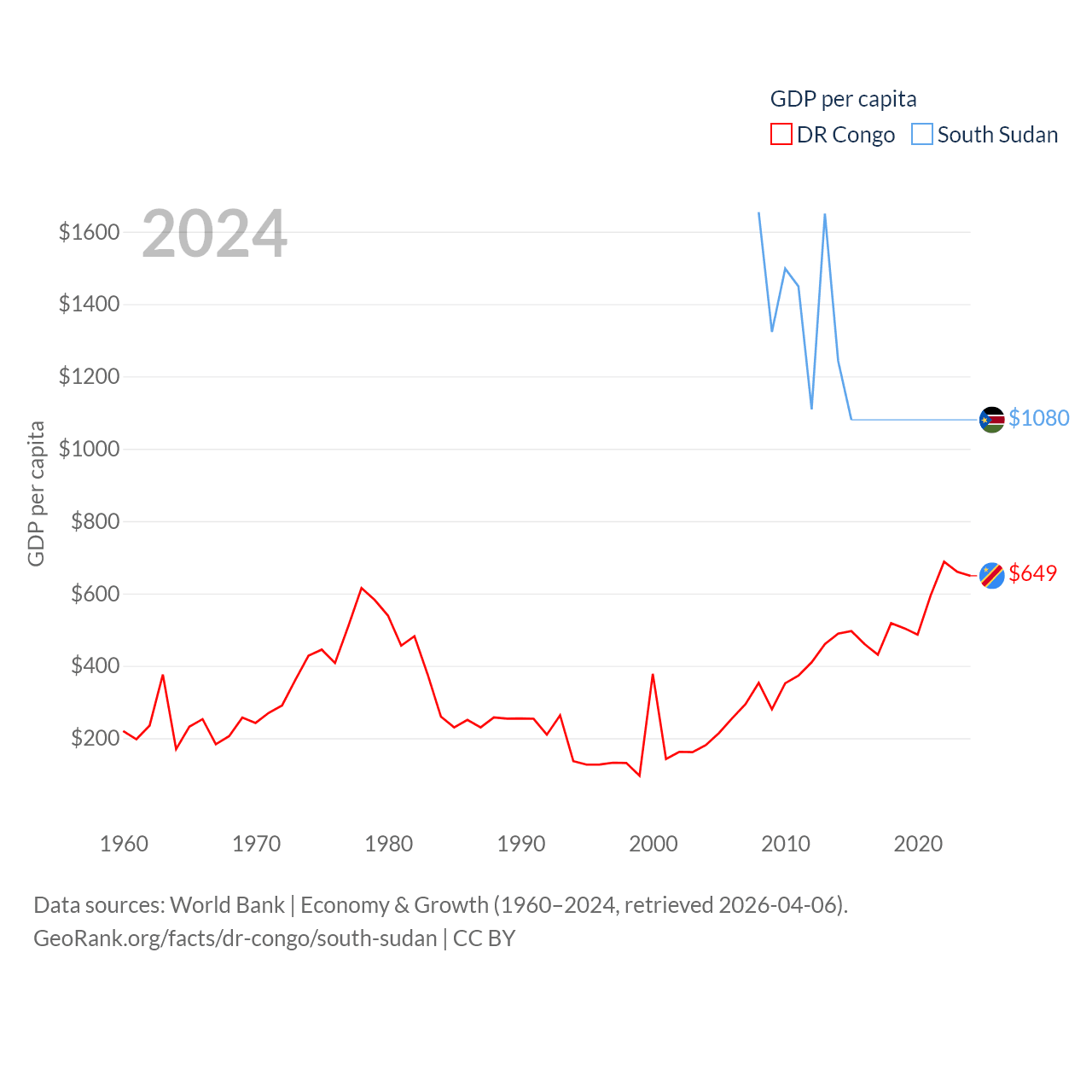 By GDP, The DR Congo ranks 87/197 ($71B) and South Sudan ranks 149/197 ($12B). By GDP per capita, The DR Congo ranks 190/197 ($649), while South Sudan ranks 175/197 ($1,080).